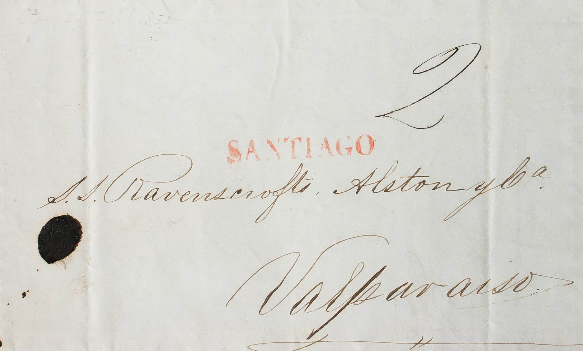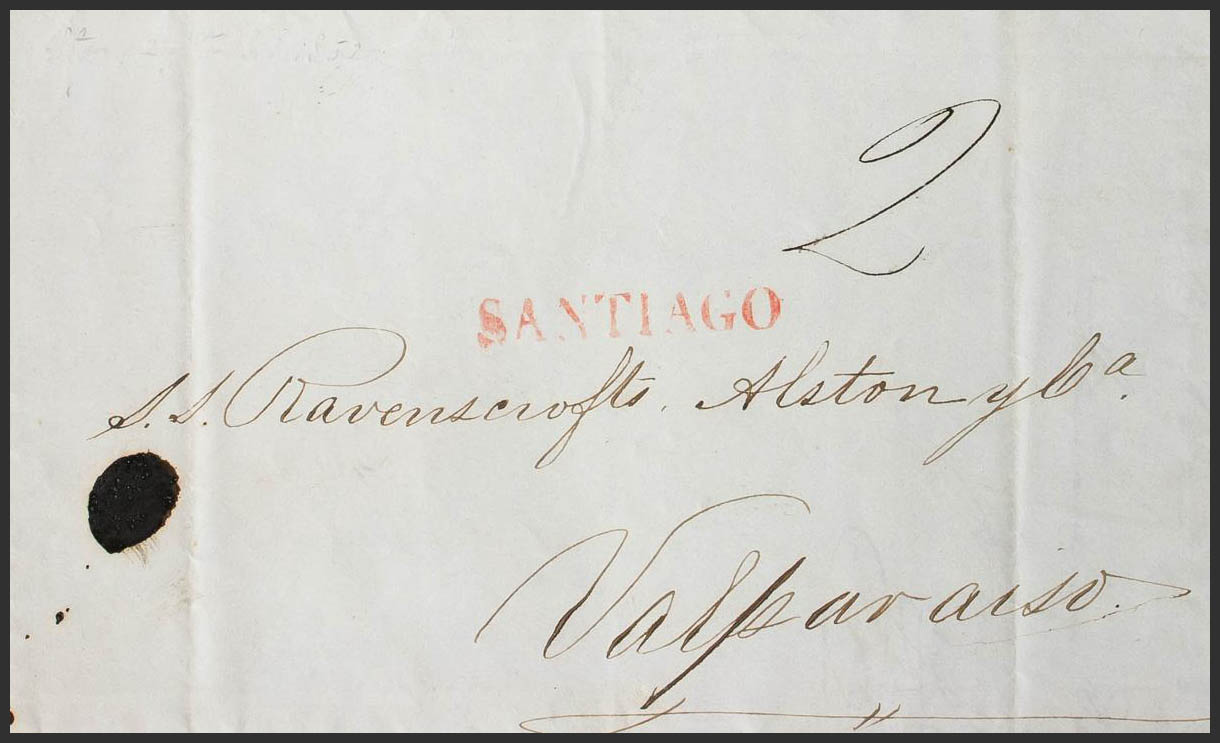 English 1852. SANTIAGO to VALPARAISO. SANTIAGO brand and handwritten portage "2 (reales)". MAGNIFICENT.