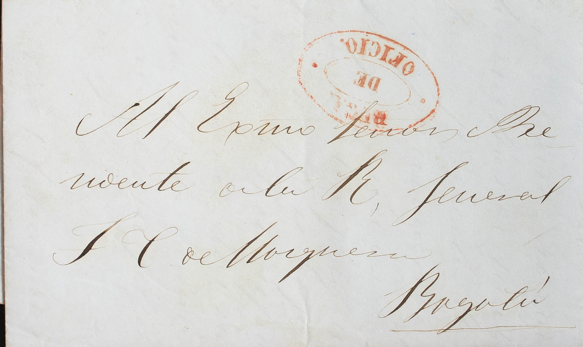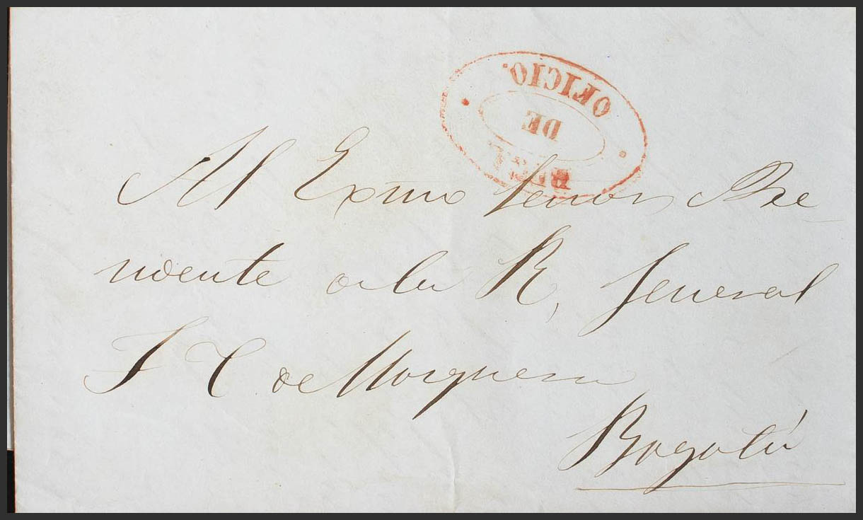 1849. BUGA to BOGOTA. BUGA / DE / OFFICIO brand, in red. MAGNIFICENT AND RARE.