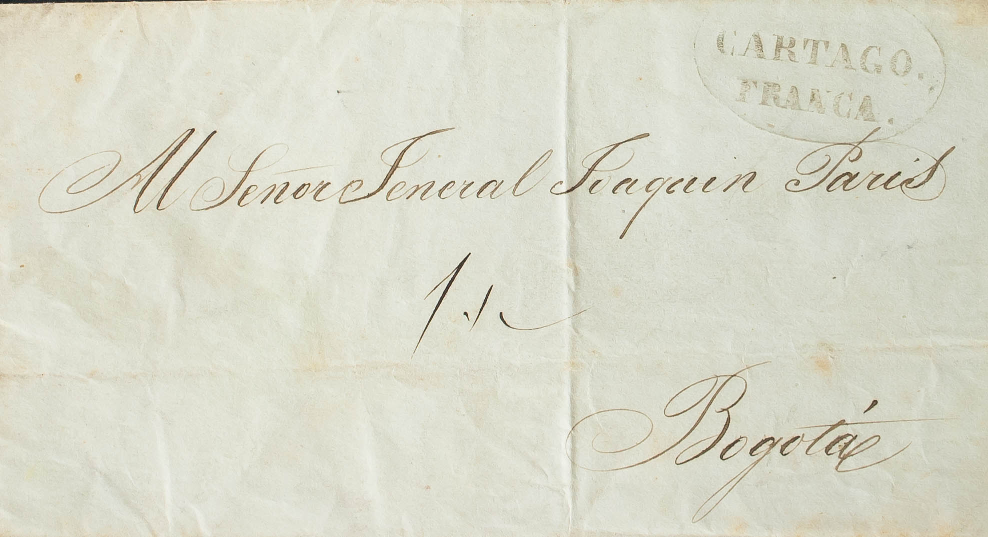English 1846. AGUADULCE to BOGOTA (addressed to General Joaquín París Ricaurte). CARTAGO / FRANCA brand, in black. MAGNIFICENT AND RARE.