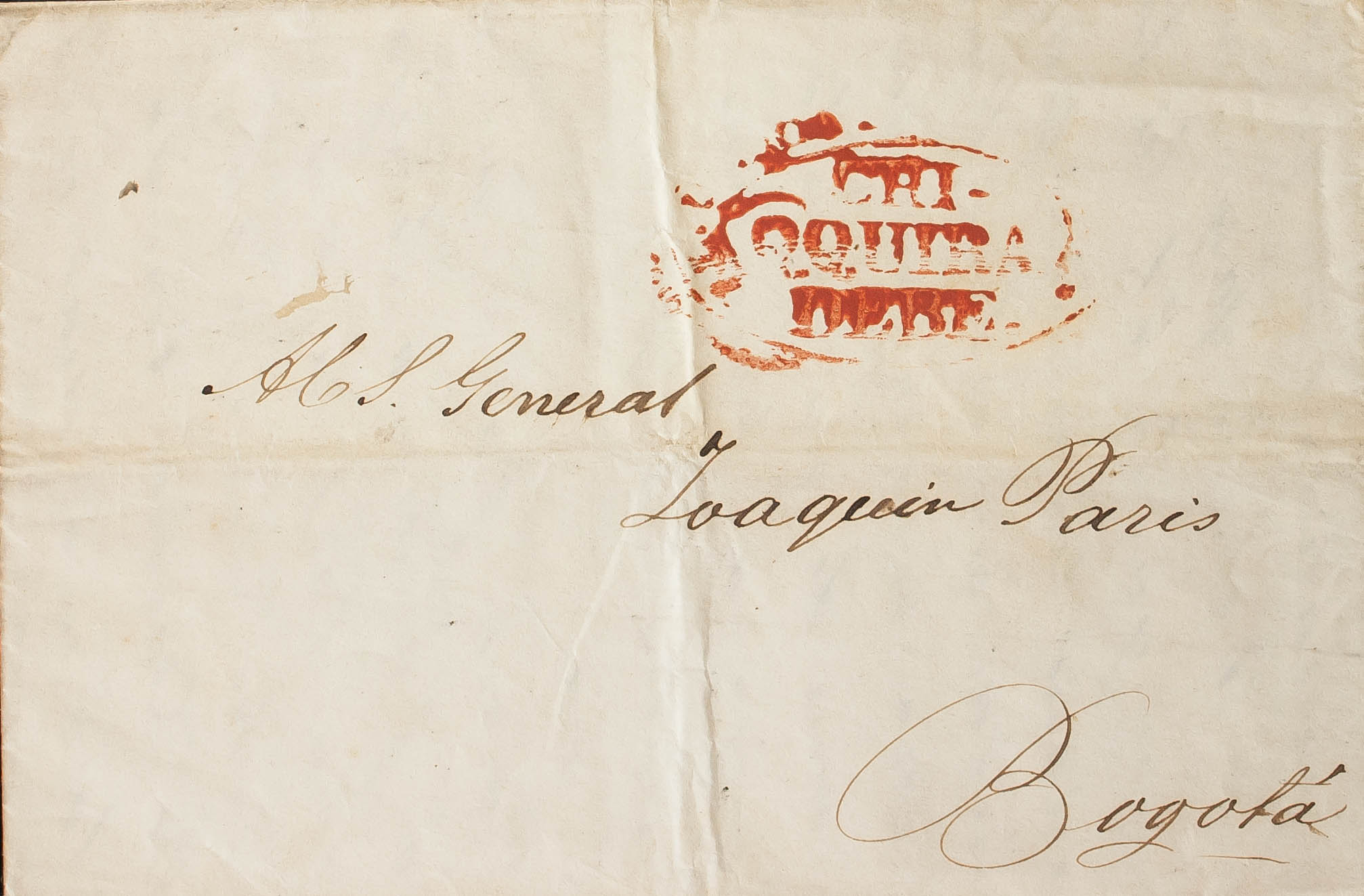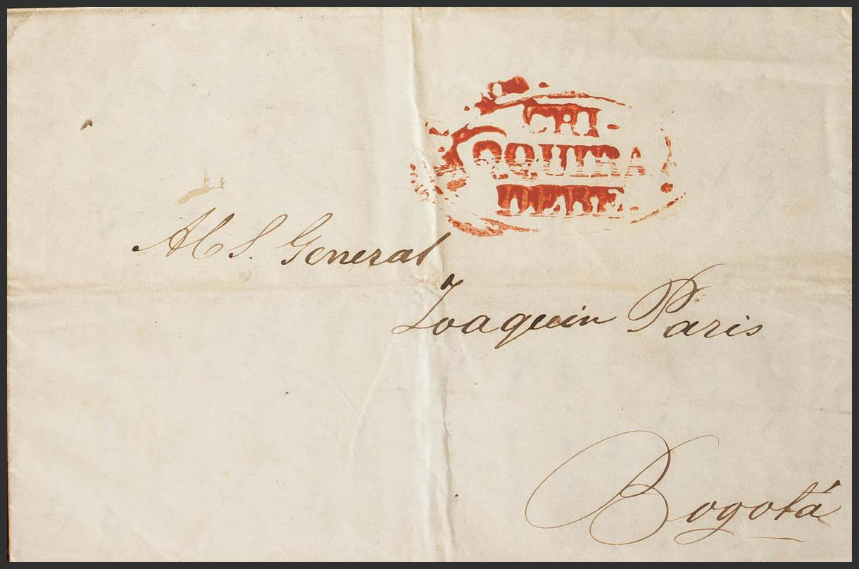 (1840ca). MINAS to BOGOTA (complete letter with date without year). REPUBLICA DE COLOMBIA / CHI / QQUIRA / DEBE mark, in red. MAGNIFICENT AND RARE.
