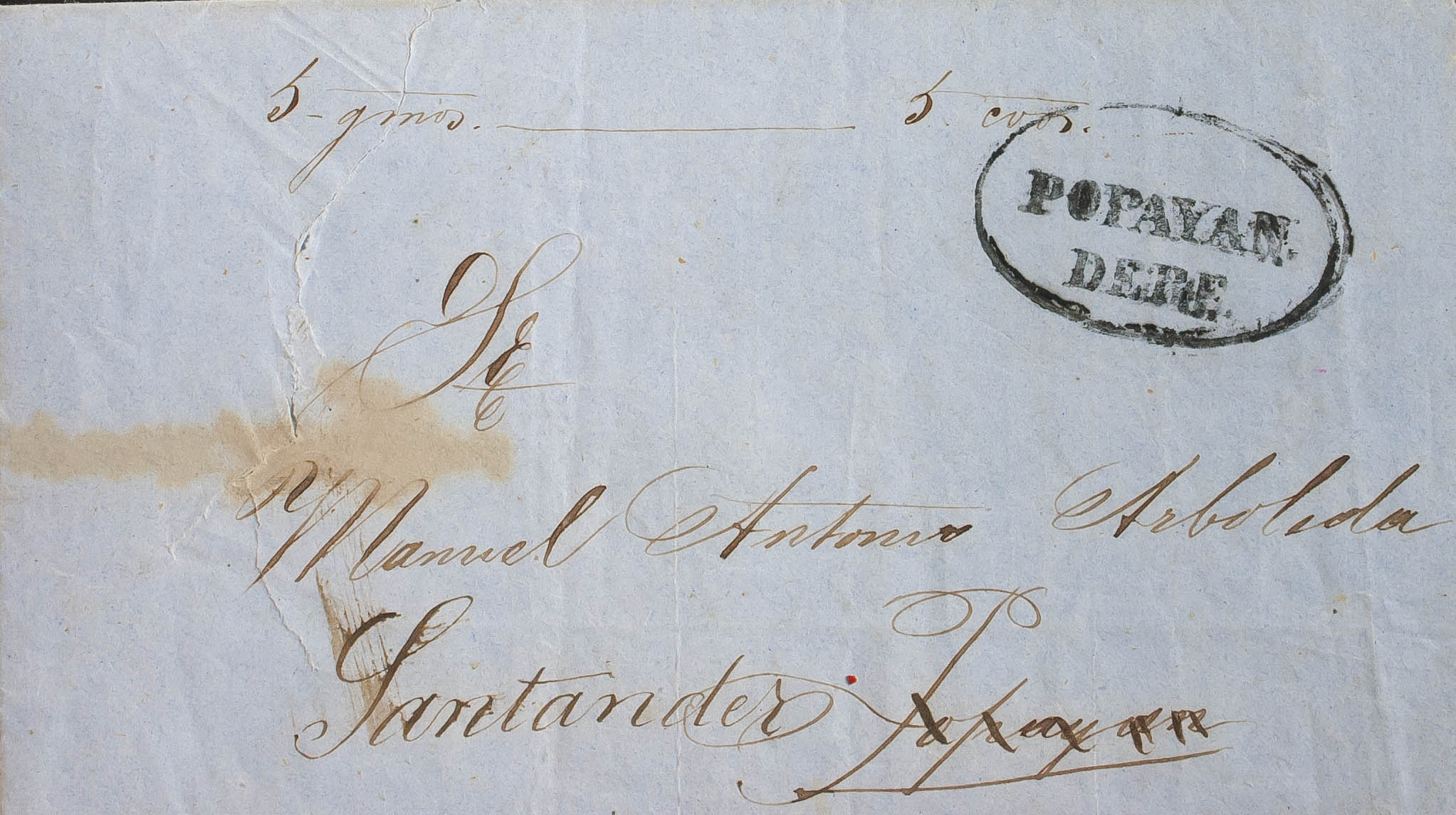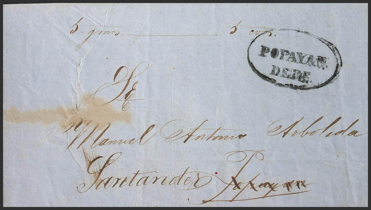 1857. GUAPI to POPAYAN, forwarded to SANTANDER (small cut without importance in the front). POPAYAN / DEBE brand, in black and handwritten annotation "5 gmos-5 cents". MAGNIFICENT.
