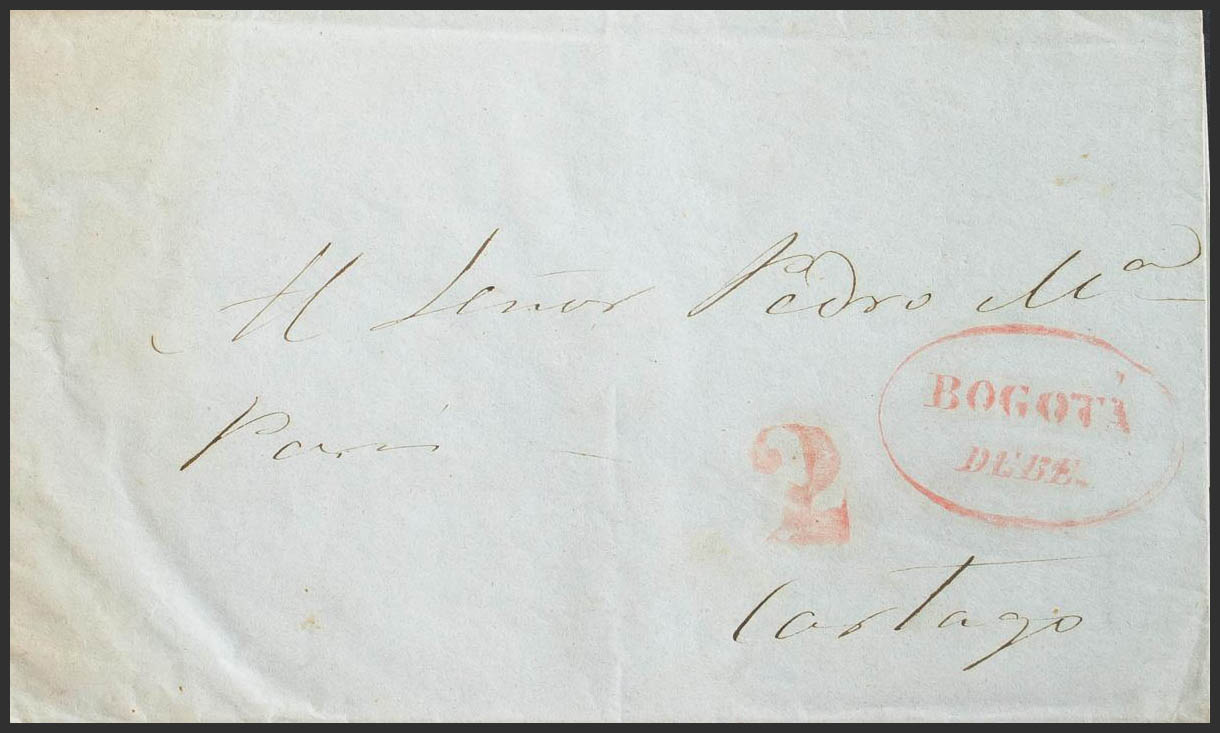 English 1846. BOGOTA to CARTHAGE. Mark BOGOTA / DEBE, in red and portage "2". MAGNIFICENT.