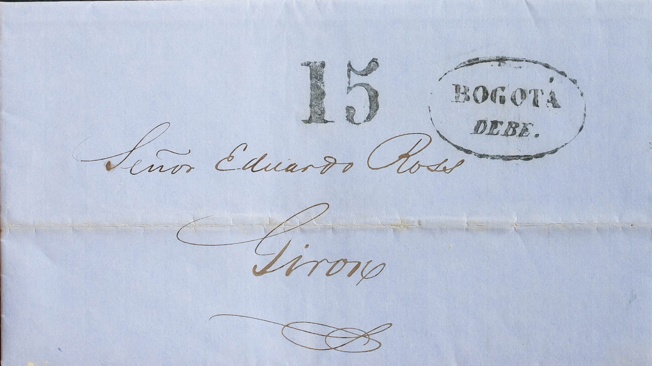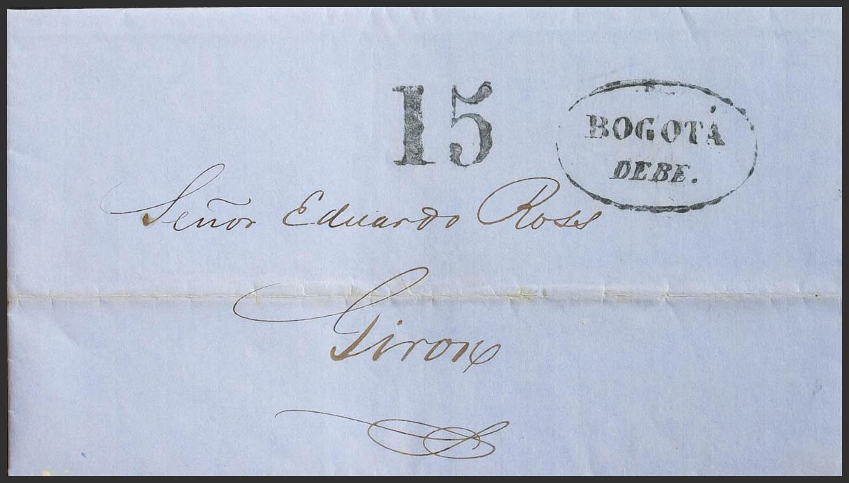 1856. BOGOTA to GIRON. BOGOTA / DEBE brand, in black and portage "15". MAGNIFICENT AND RARE.