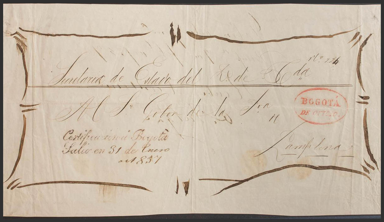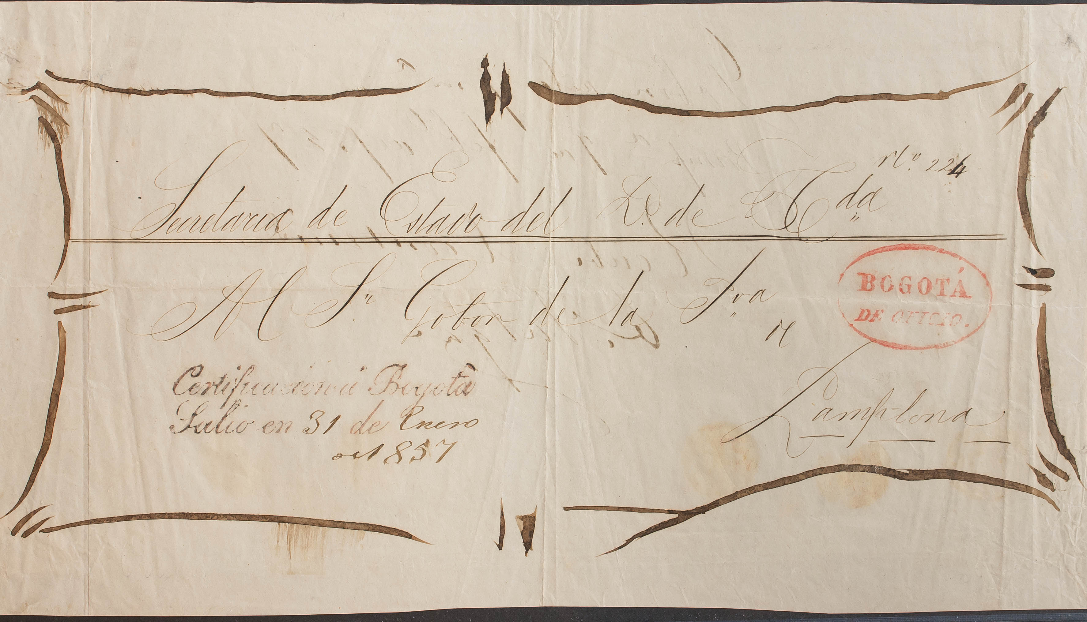 1857. Front of Certificate from SANTA FE DE BOGOTA to PAMPLONA. Marks CERTIFICATION TO BOGOTA / SALIO EN JANUARY 31, 1857, in black and BOGOTA / DE OFFICIO, in red (ink crosses in the corners and on the back "I received"). MAGNIFICENT AND RARE.