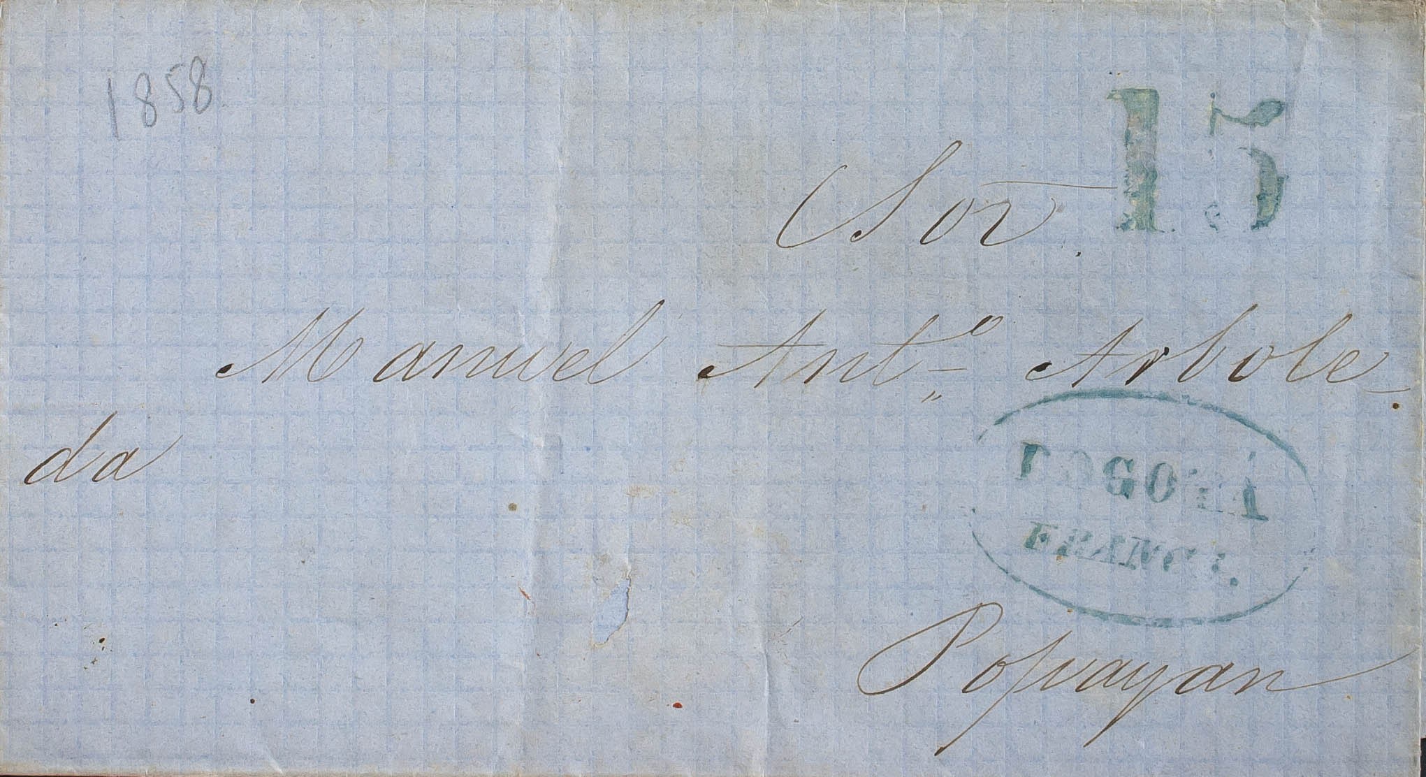 English (1858ca). BOGOTA to POPAYAN. BOGOTA / FRANCA brand, in blue. MAGNIFICENT.