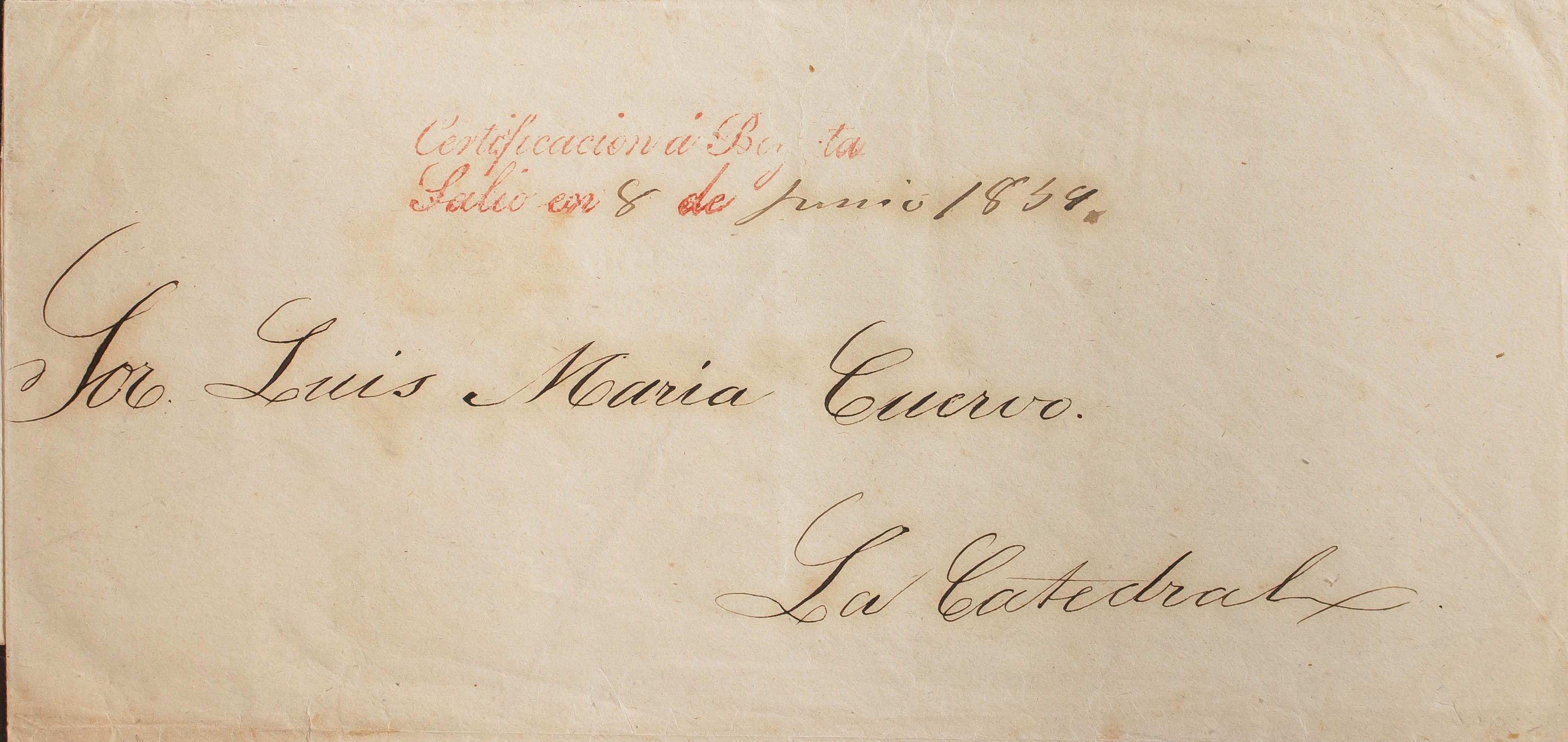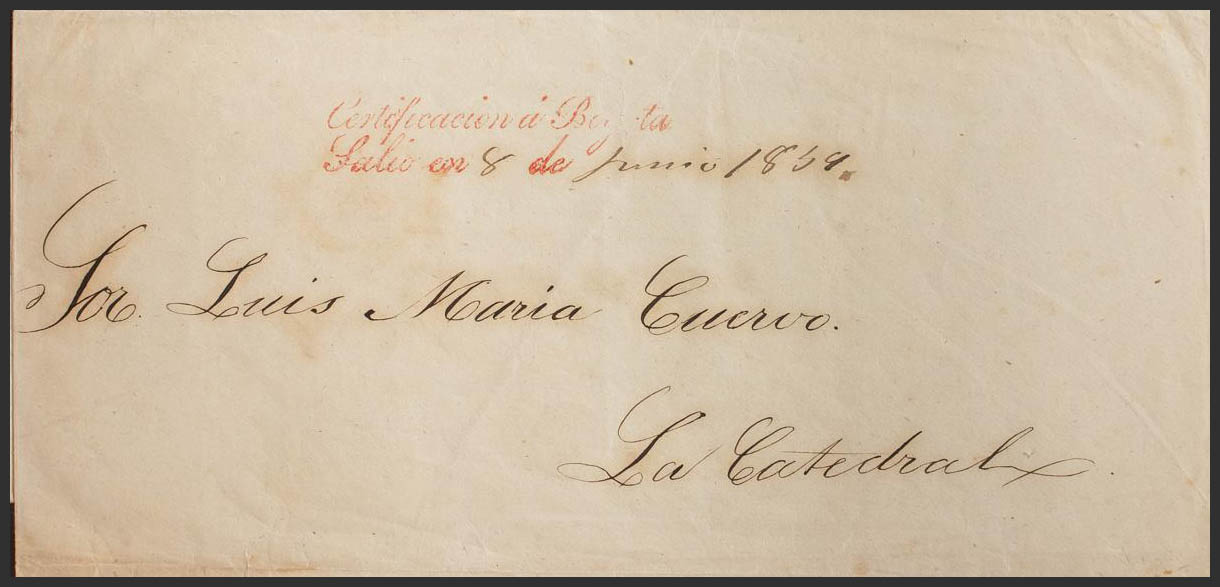 1859. Certificate from SANTA FE DE BOGOTA to LA CATEDRAL. Mark CERTIFICATION TO BOGOTA / SENT ON JUNE 8, 1859 (recipient "I received" on the back). MAGNIFICENT AND VERY RARE.