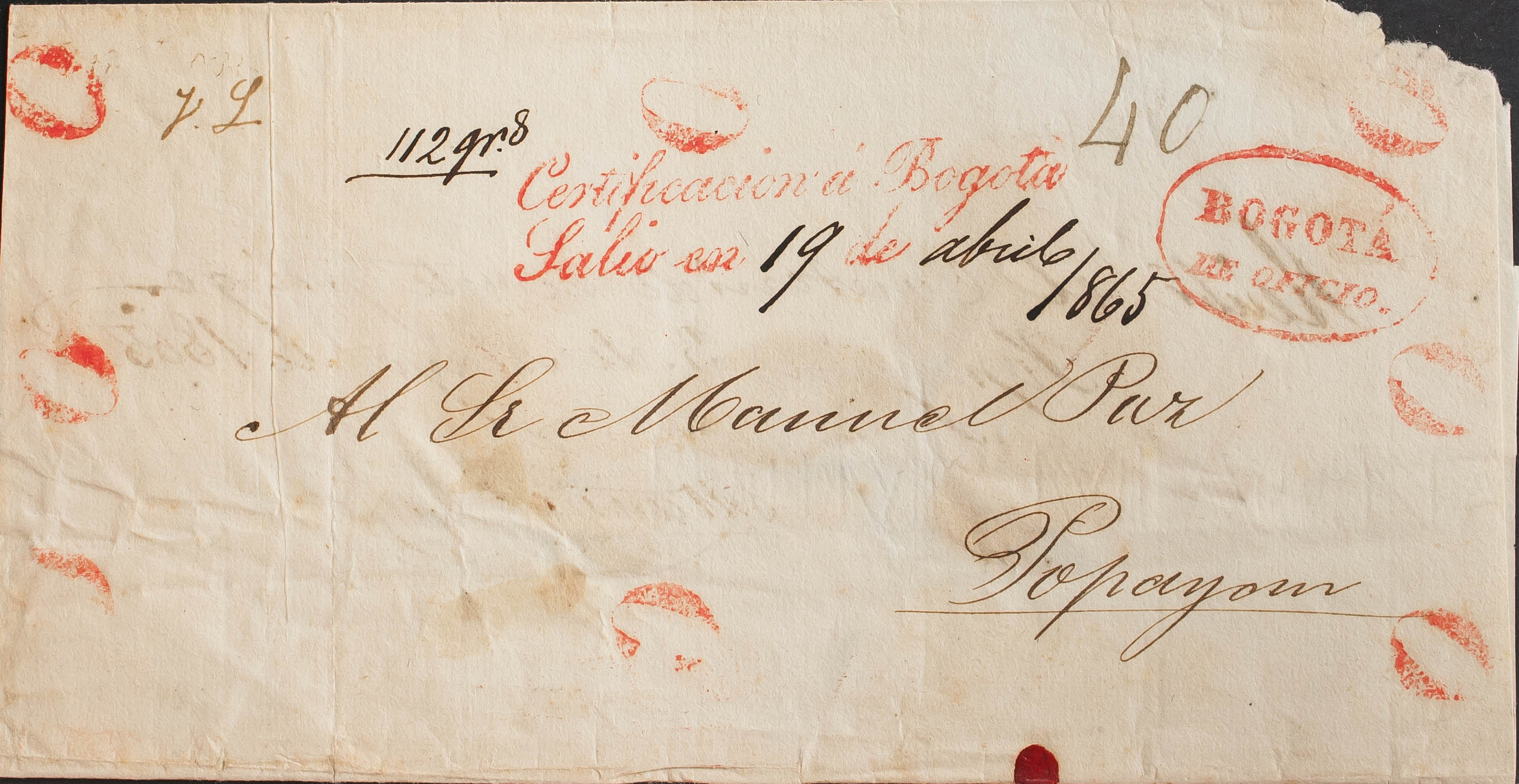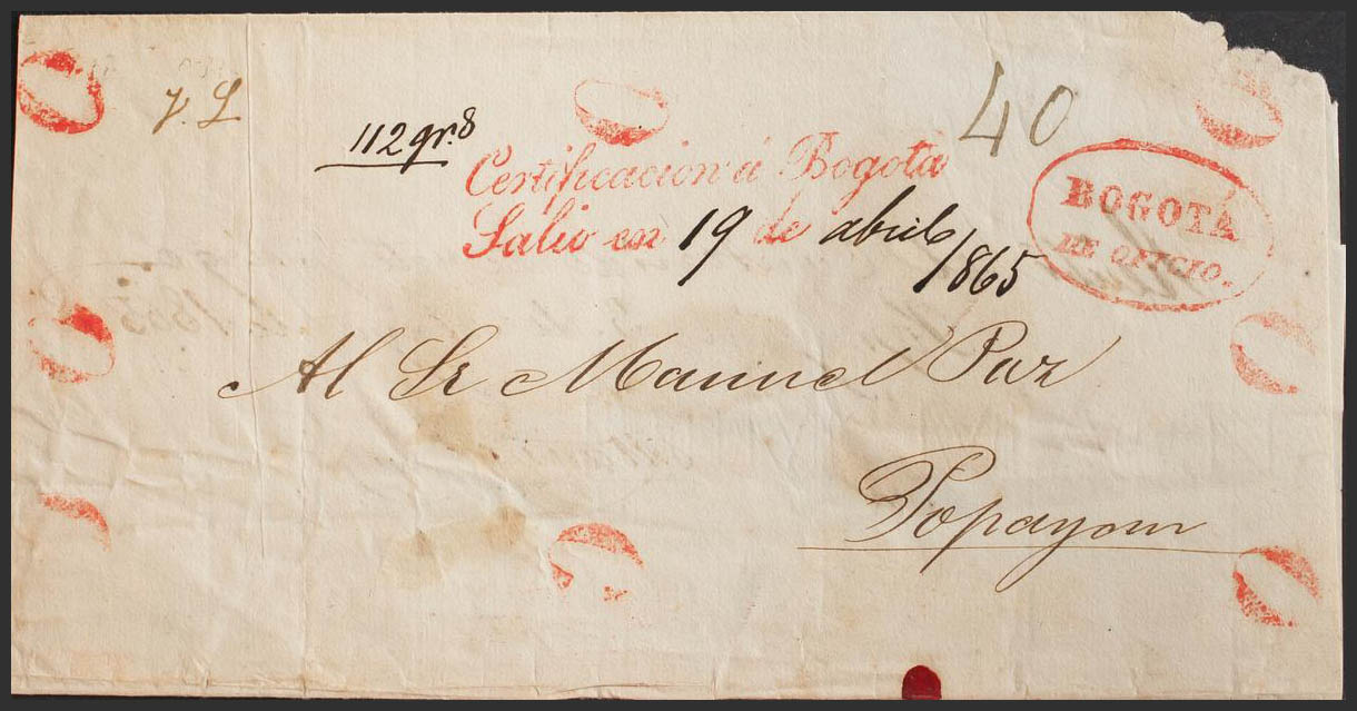 1865. Certificate from SANTA FE DE BOGOTA to POPAYAN. Marks CERTIFICATION TO BOGOTA / SALIO EN 19 DE APRIL 1865, BOGOTA / DE OFFICIO and "0" in the corners and "RecibÃ", inside as required for certified mail, on the back wafer seals with brand UNITED STATES OF COLOMBIA / POSTAL ADDRESS. MAGNIFICENT AND RARE.