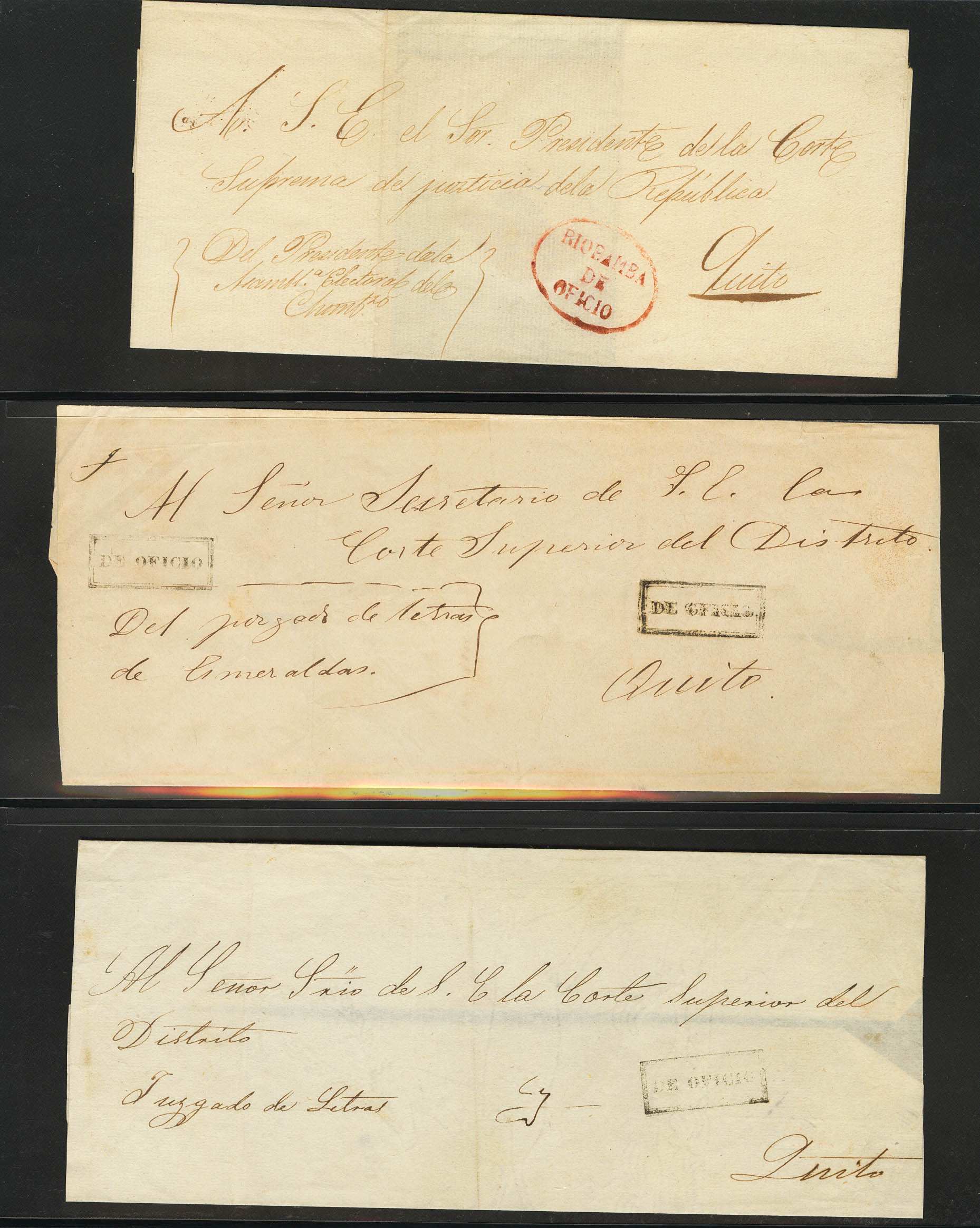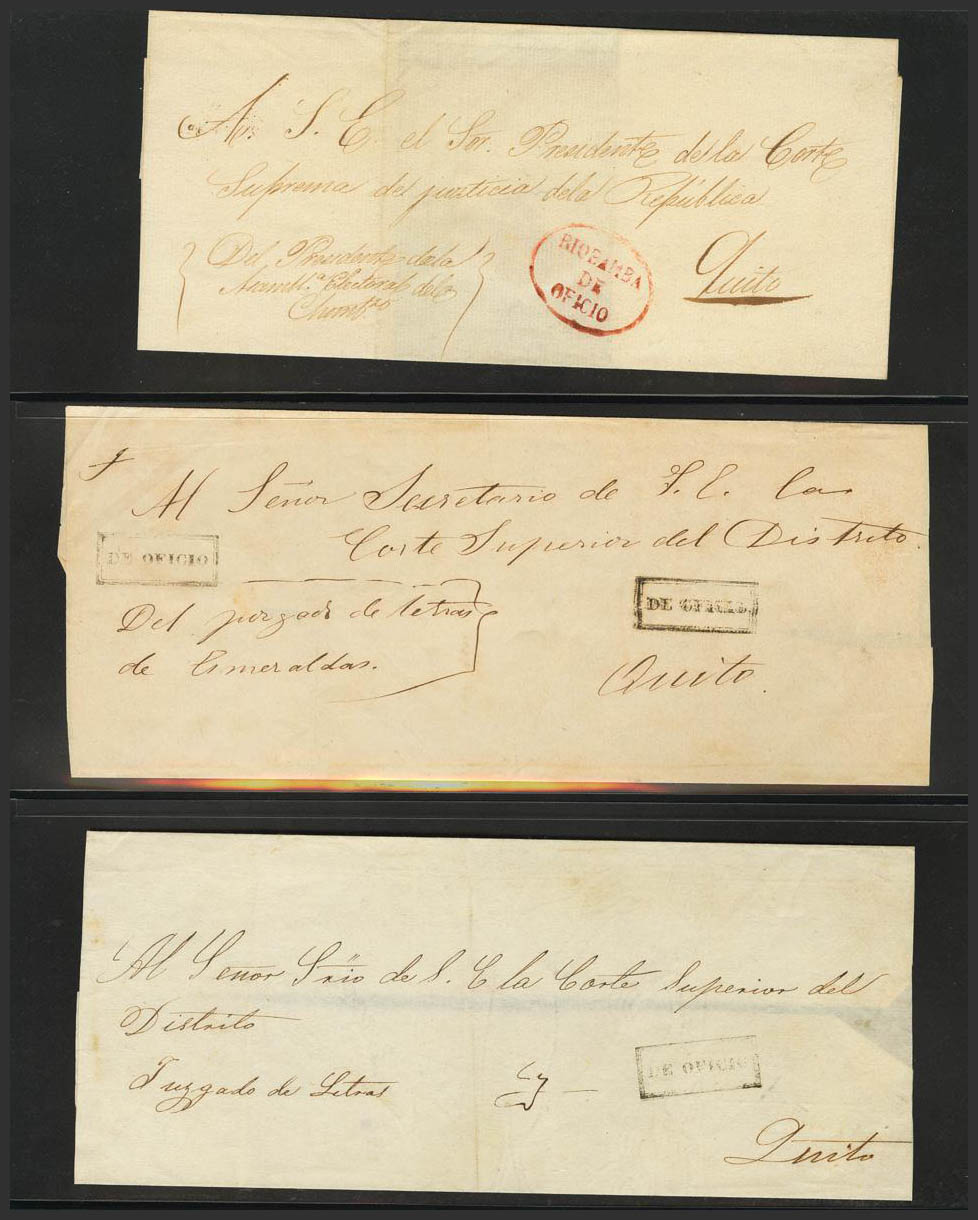 (1850ca). Interesting collection of Judicial Escrows from Ecuador circulated between 1850 and 1860, all with different markings in red or black. MAGNIFICENT AND RARE SET.