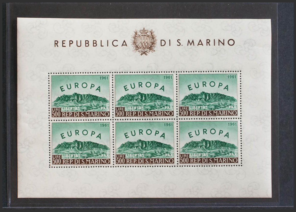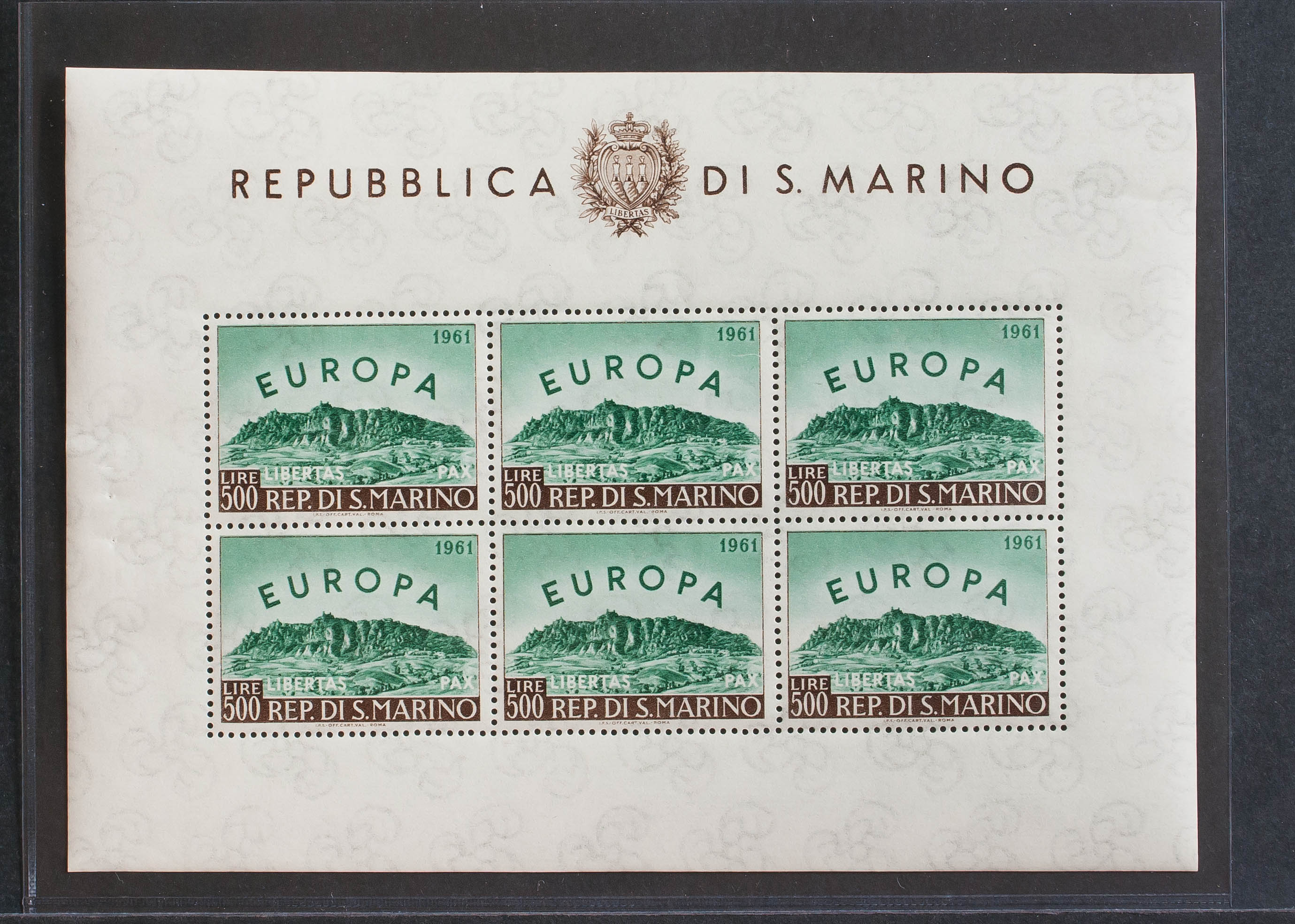English ★★Yvert 523(6). 1961. 500 l green and brown, mini sheet of six stamps. MAGNIFICENT.