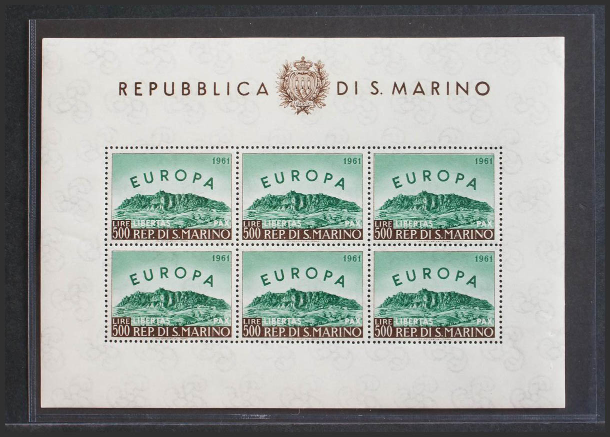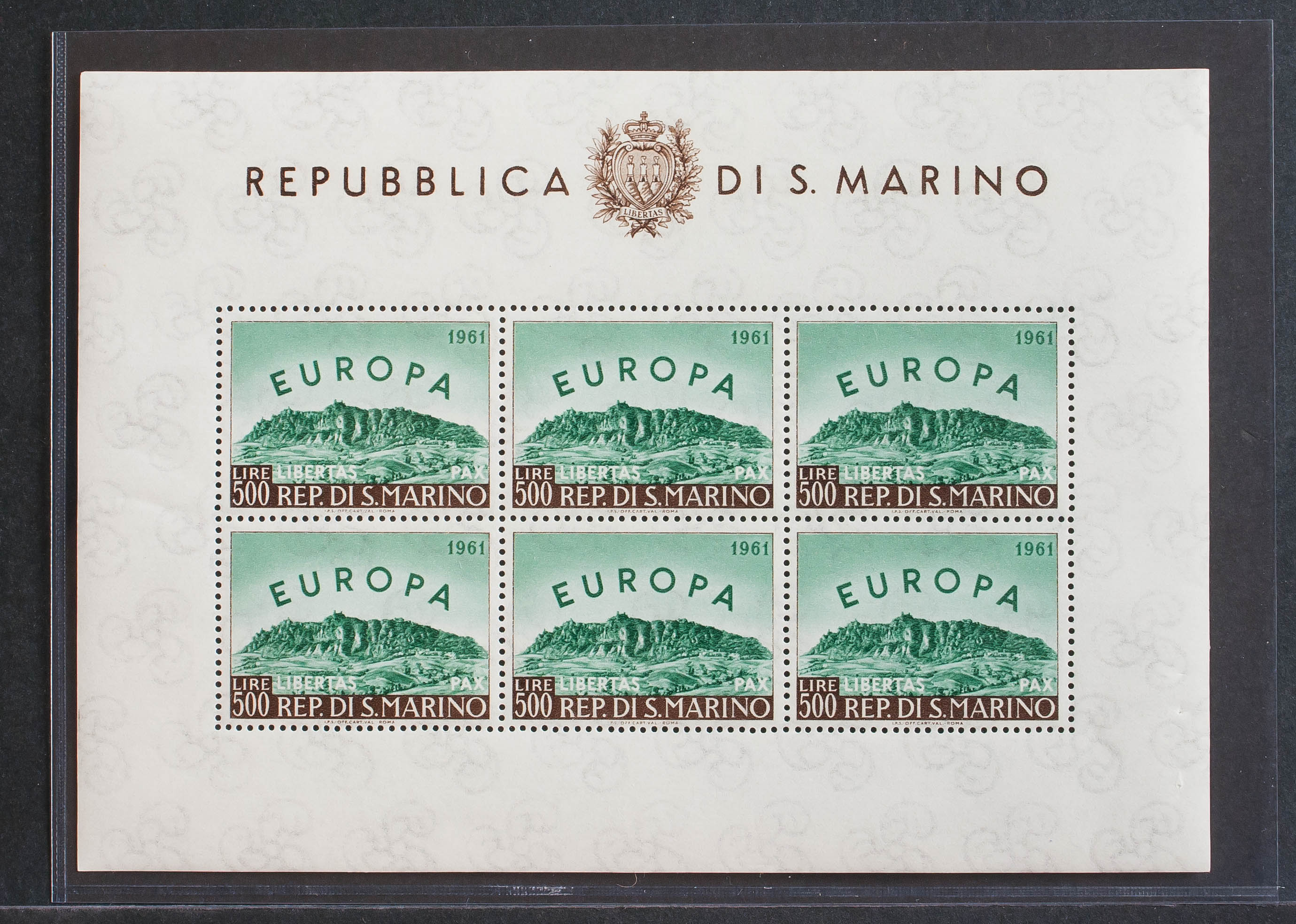 English ★★Yvert 523(6). 1961. 500 l green and brown, mini sheet of six stamps. MAGNIFICENT.
