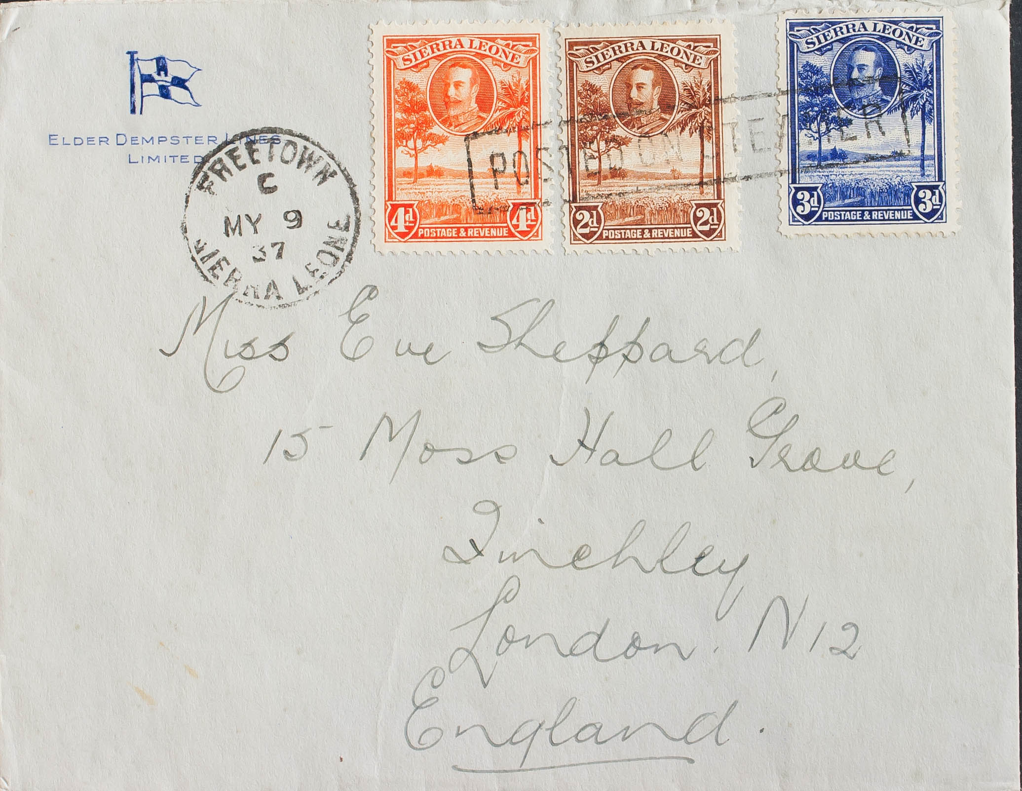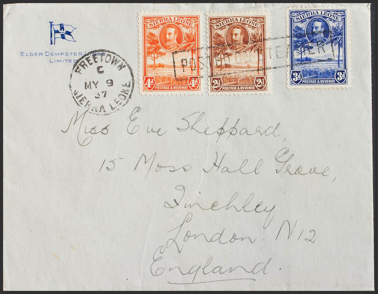 Yvert 125/30. 1937. ½ p, 1 p, 1 ½ p (back), 2 p, 3 p and 4 p. FREETOWN to LONDON (ENGLAND). Postmark POSTED ON STEAMER on the front and FREETOWN / SIERRA LEONE on the back. MAGNIFICENT.