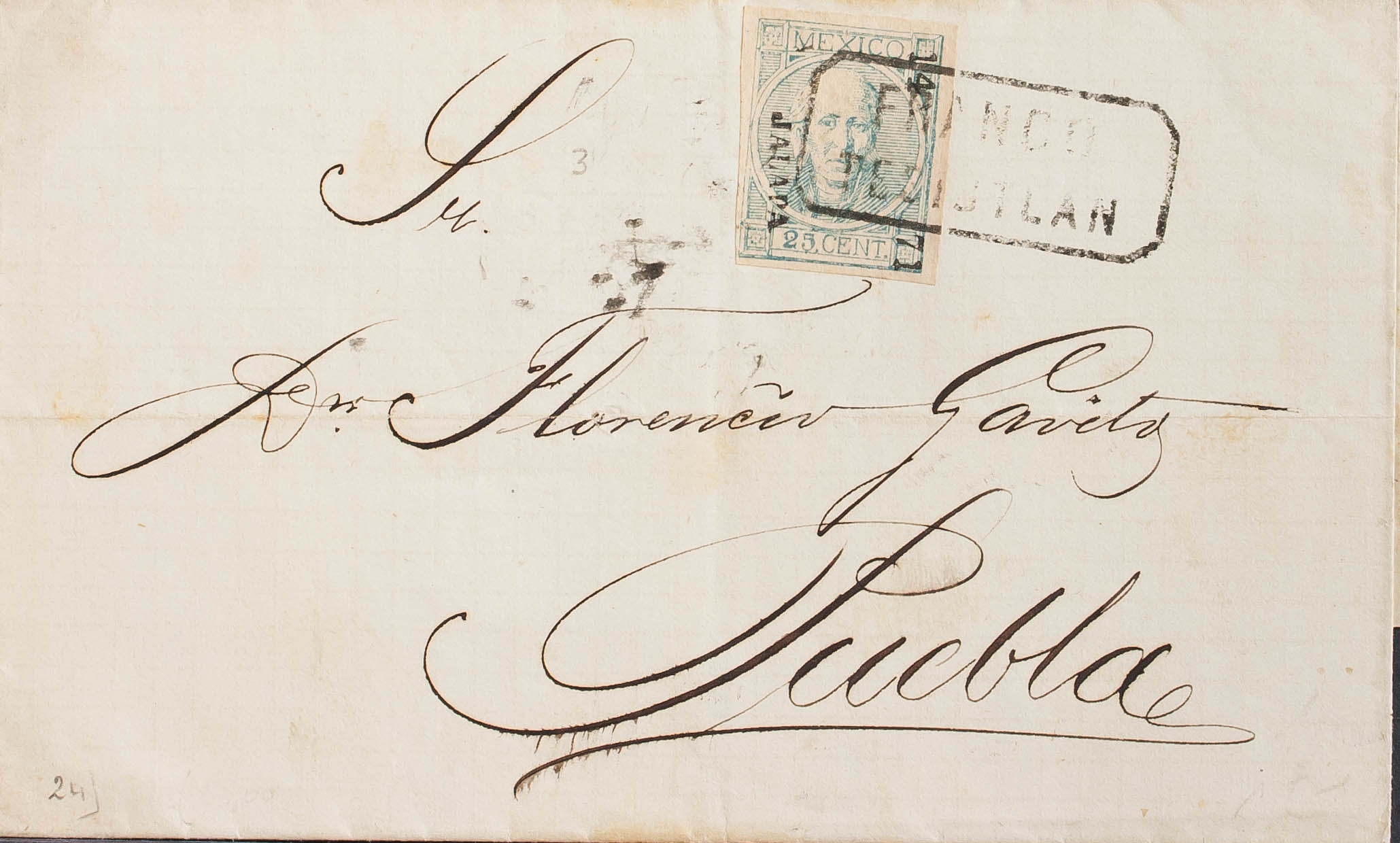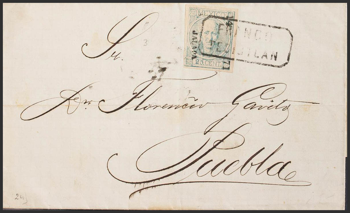 Yvert 45. 1871. 25 cts blue on pink (14 71 JALAPA). TEZIUTLAN to PUEBLA. Postmark FRANCO / TESIUTLAN. MAGNIFICENT.