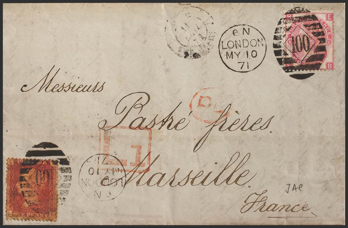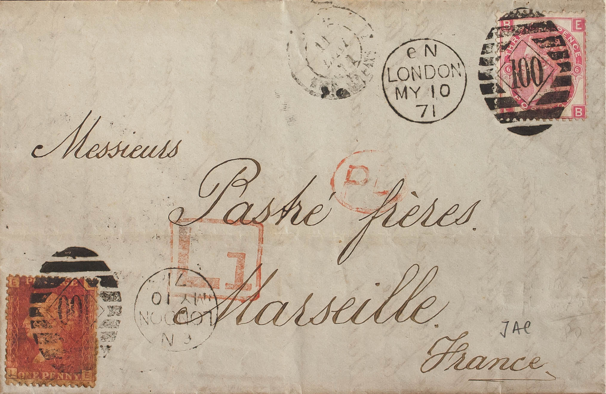 Yvert 26, 33. 1871. 1 p carmine red Plate 118 and 3 p pink Plate 6. LONDON to MARSEILLE (FRANCE). Duplex postmark LONDON / 100. MAGNIFICENT. (SG43, 103)