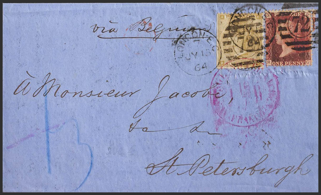 English Yvert 26, 23. 1864. 1 p carmine red Plate 84 and 9 p light yellow chestnut (left margin cut with scissors). LONDON to SAINT PETERSBURG (RUSSIA). MAGNIFICENT AND UNUSUAL DESTINATION.