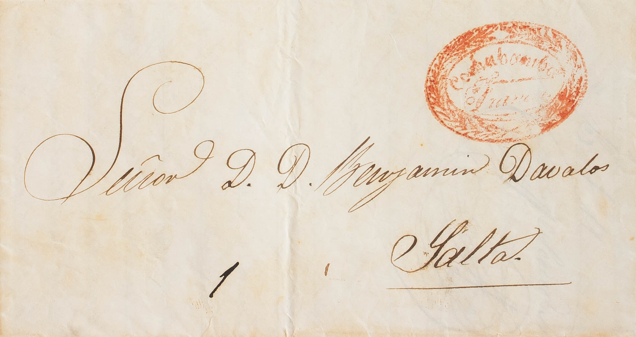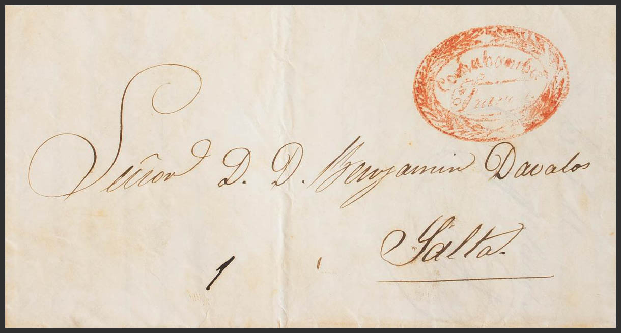 1854. COCHABAMBA to SALTA (ARGENTINA). Brand COCHABAMBA / FRANCO, in red and portage "1" handwritten. MAGNIFICENT.