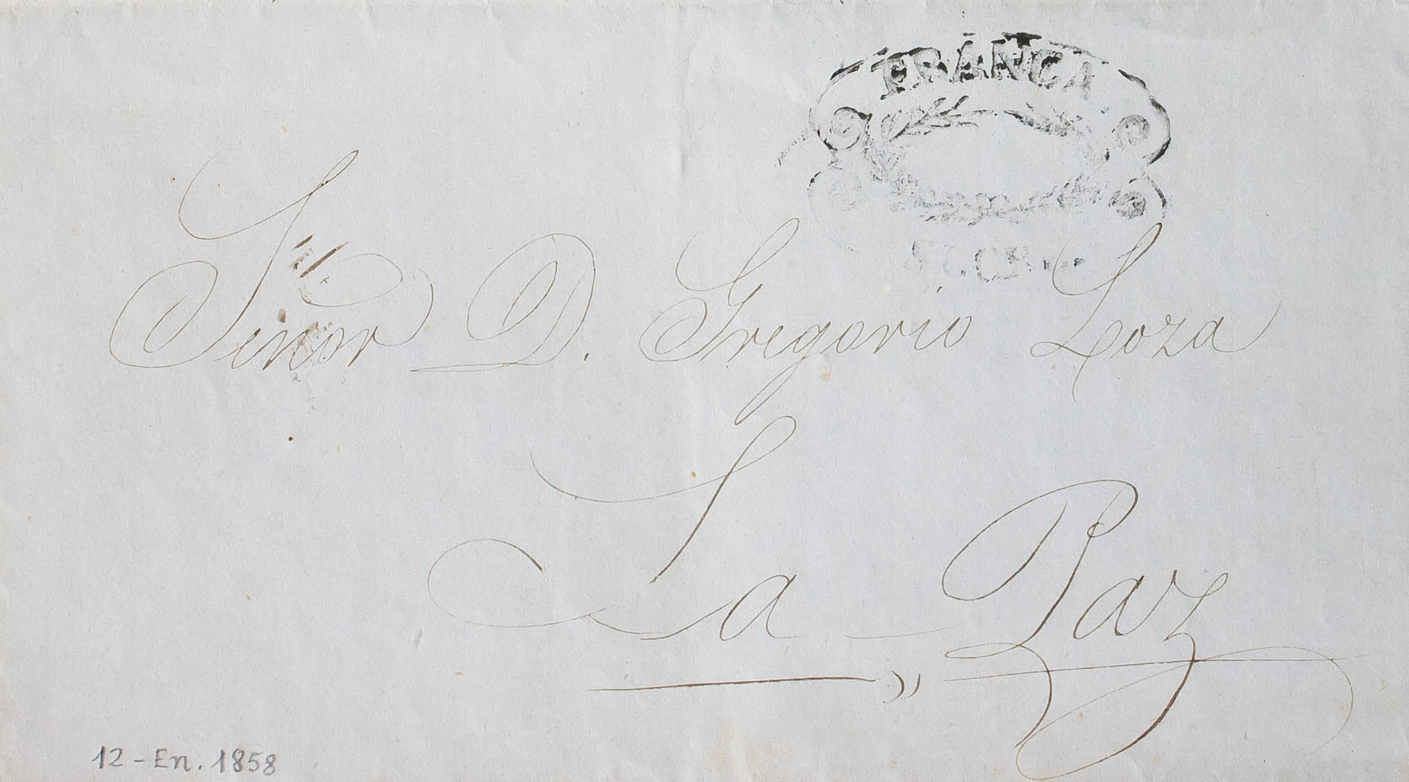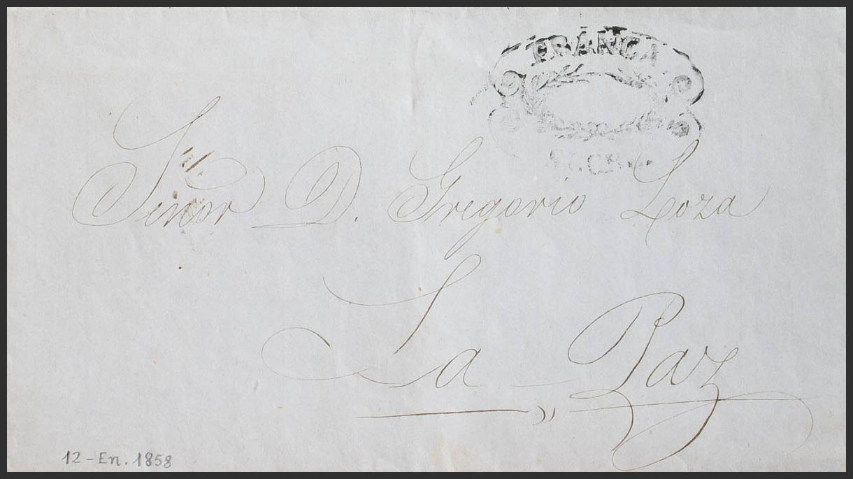 1858. SUCRE to LA PAZ. FRANCA / SUCRE brand, in black. MAGNIFICENT.