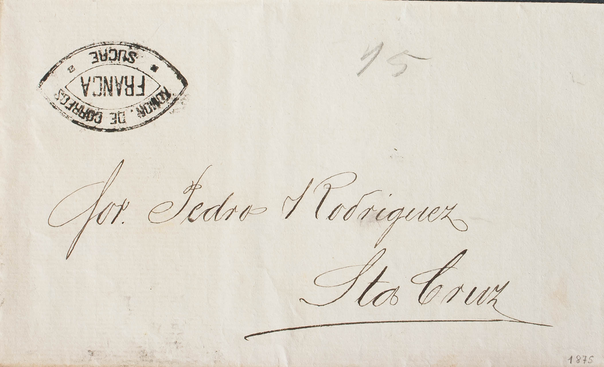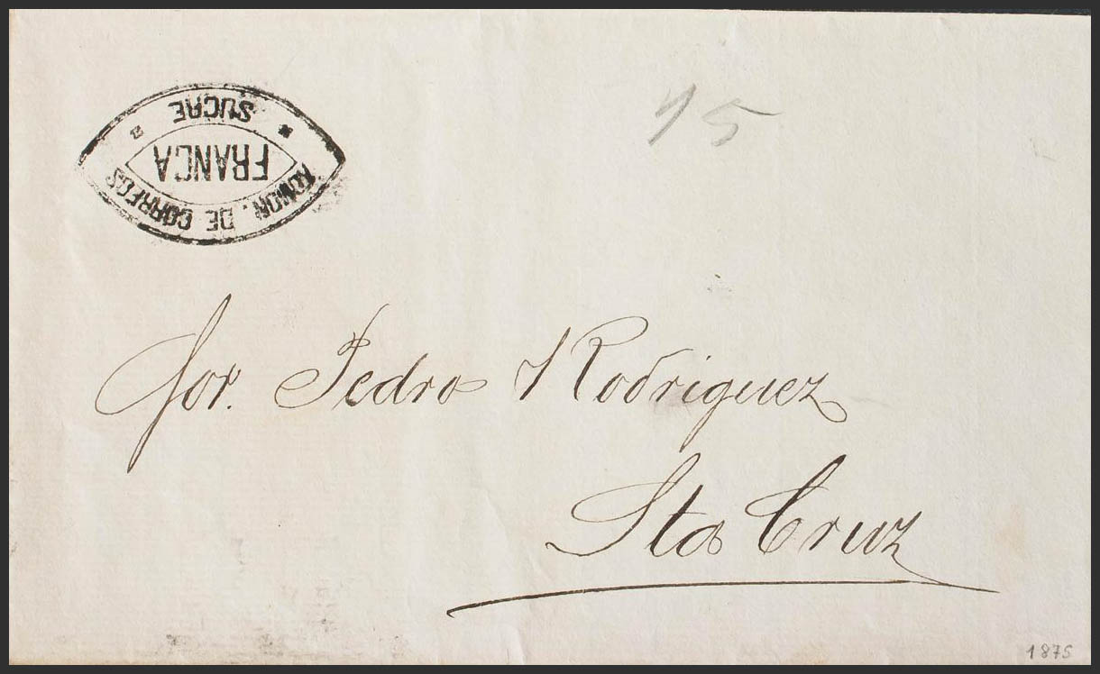 1875. SUCRE to SANTA CRUZ. ADMON mark. CORREOS / FRANCA / SUCRE, in black. MAGNIFICENT.