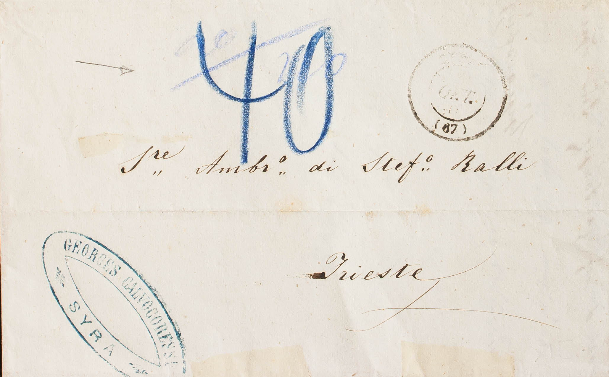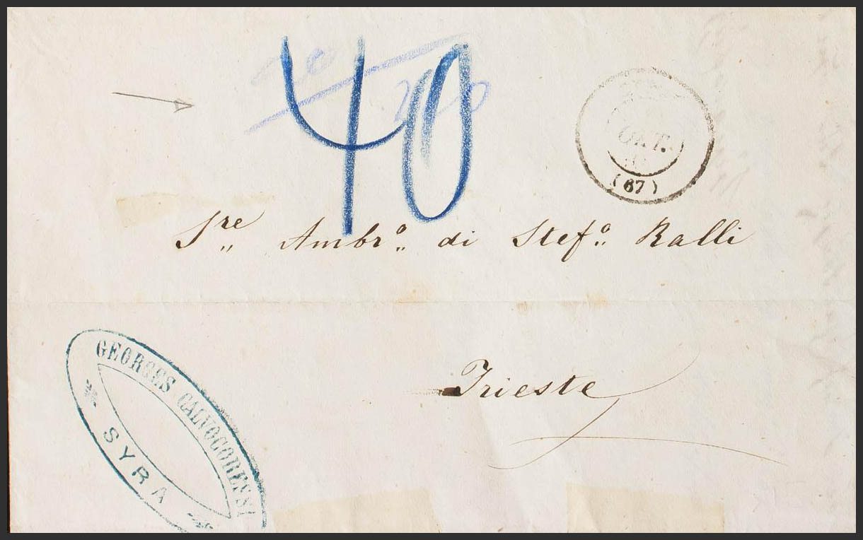 English 1867. SYROS to TRIESTE. Dater SYROS / (67) and corrected handwriting. MAGNIFICENT.