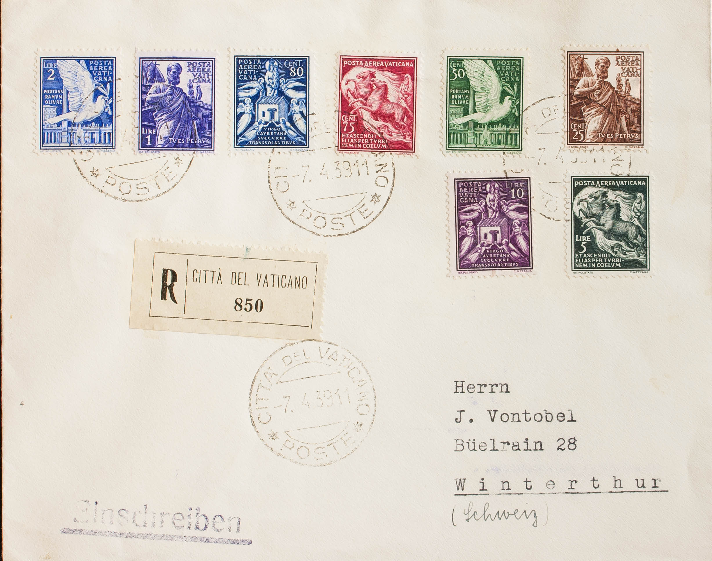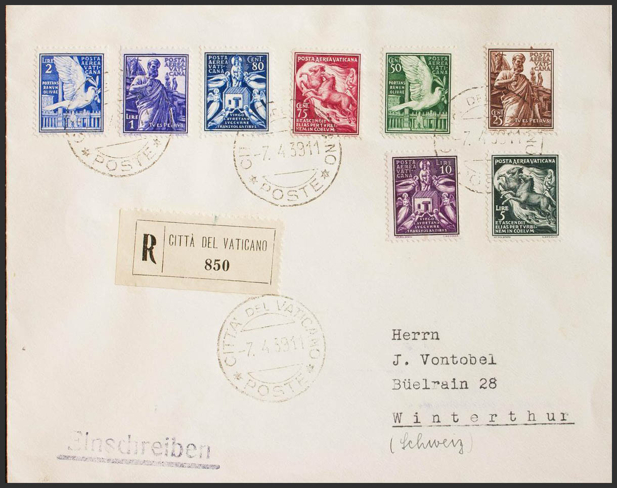 Yvert 1/8. 1939. Complete series. Certificate from VATICAN CITY to WINTERTHUR (SWITZERLAND). On the back arrival. MAGNIFICENT.