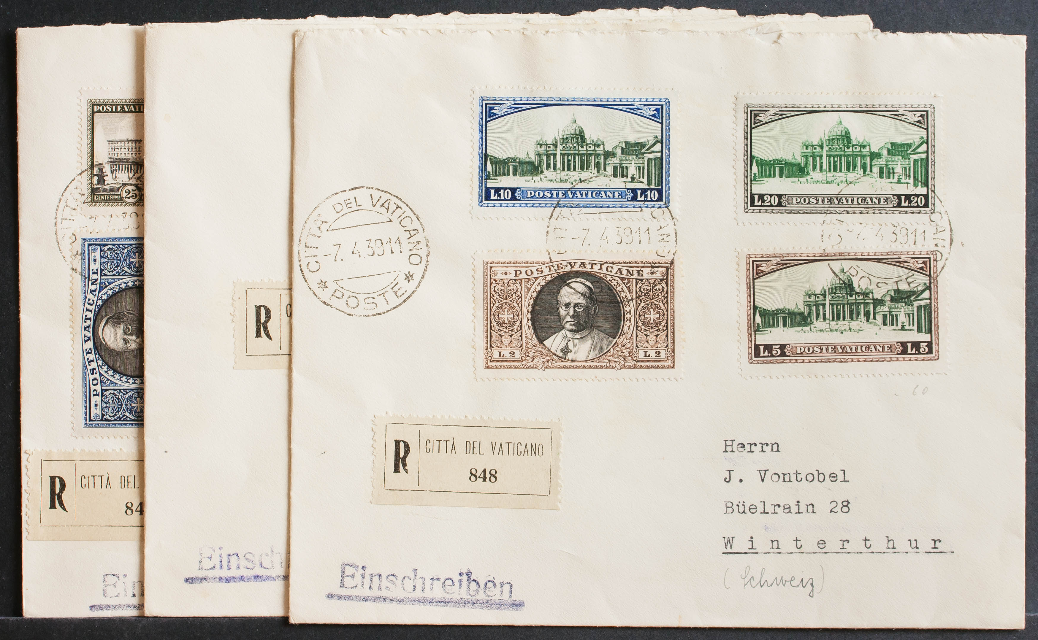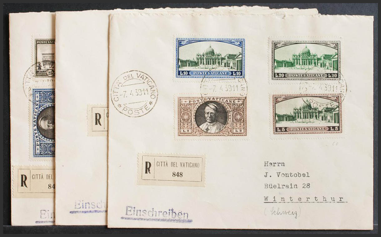 Yvert 44/59. 1939. Complete series, including urgent on three Certified Letters from VATICAN CITY to WINTERTHUR (SWITZERLAND). On the back arrival. MAGNIFICENT.