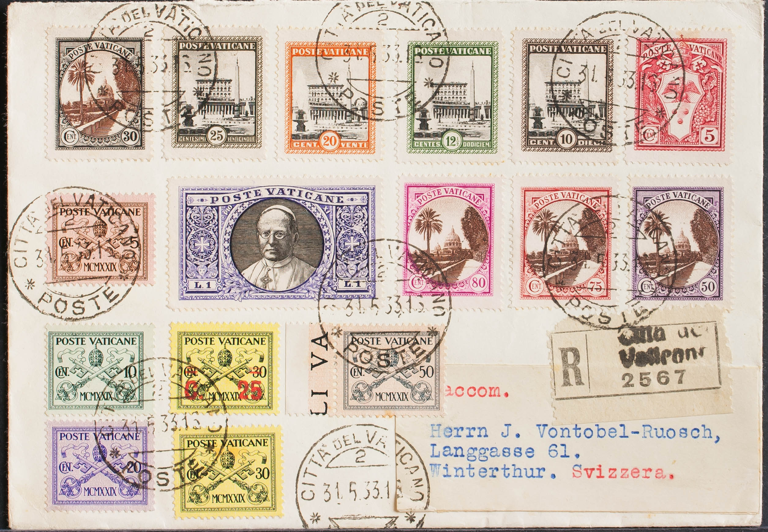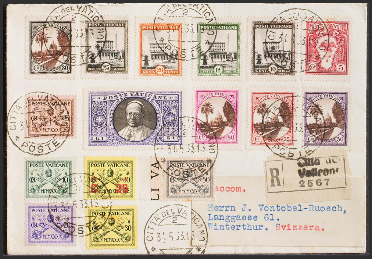 Yvert 44/53, 26/28, 30/31, 39. 1933. Various values. Certificate from VATICAN CITY to WINTERTHUR (SWITZERLAND). On the back arrival. MAGNIFICENT.
