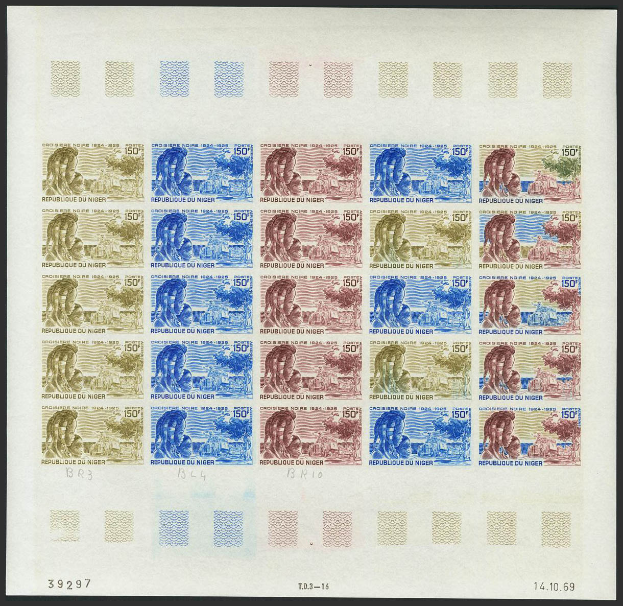 English ★★Yvert 117(25). 1969. 150 f multicolored, complete sheet of twenty-five stamps. COLOR TRIALS and WITHOUT DENTATION, in different colors and including the multicolors of the last row. MAGNIFICENT AND RARE.