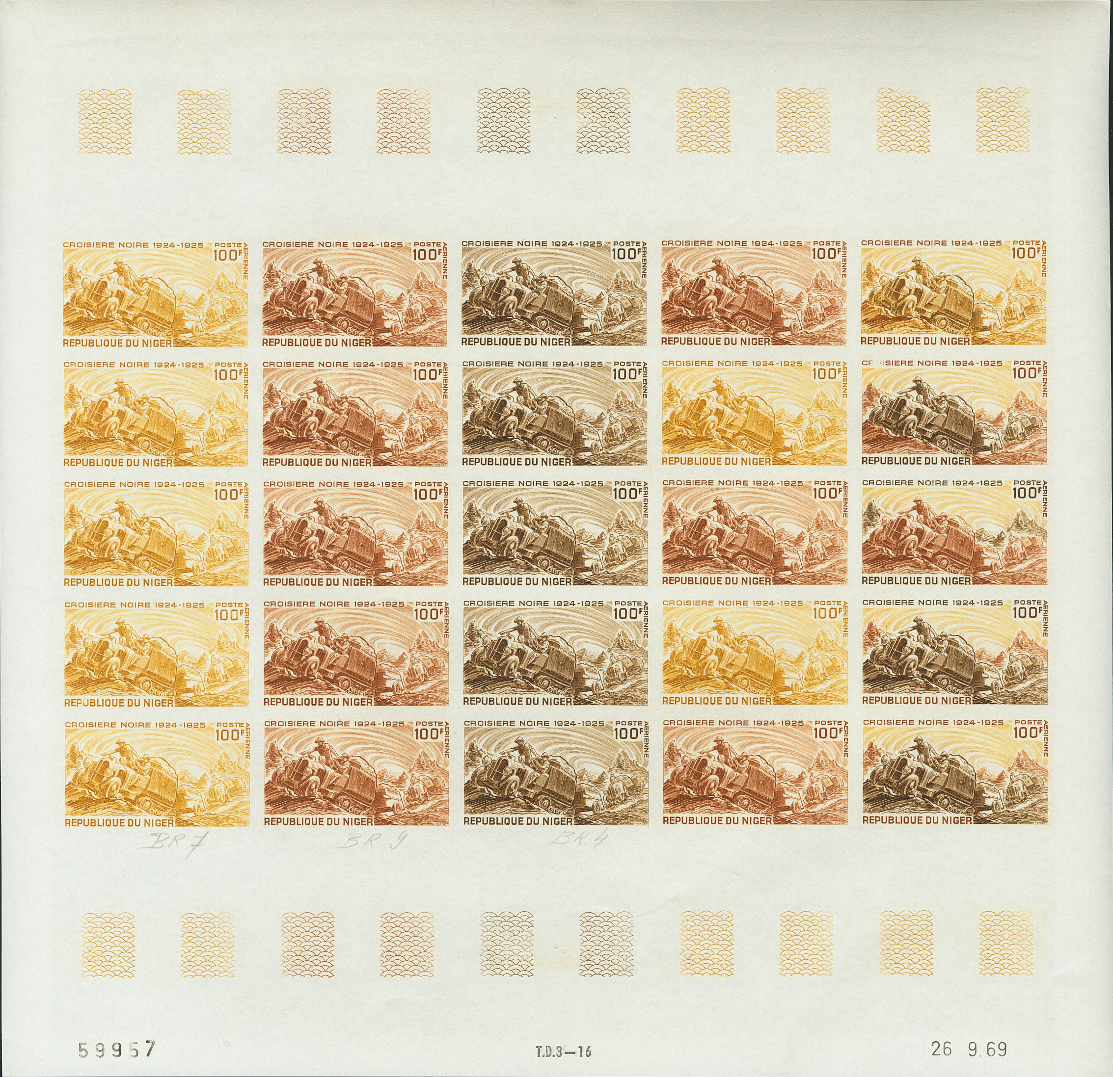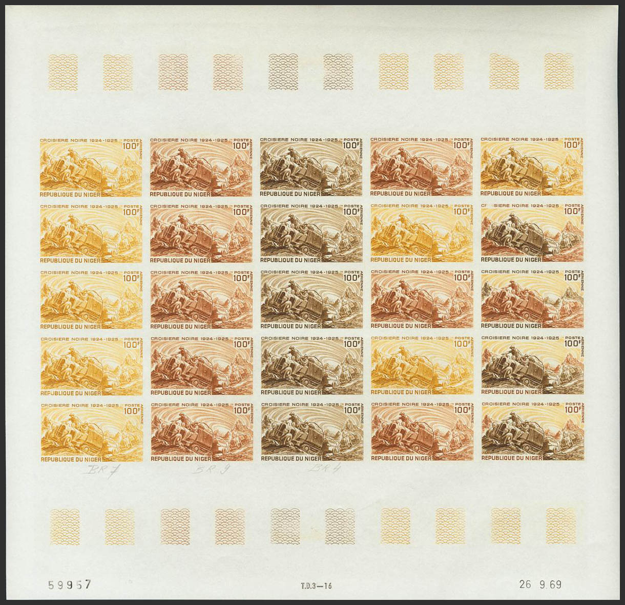 ★★Yvert 116(25). 1969. 100 f multicolored, complete sheet of twenty-five stamps. COLOR TRIALS and WITHOUT DENTATION, in different colors and including the multicolors of the last row. MAGNIFICENT AND RARE.