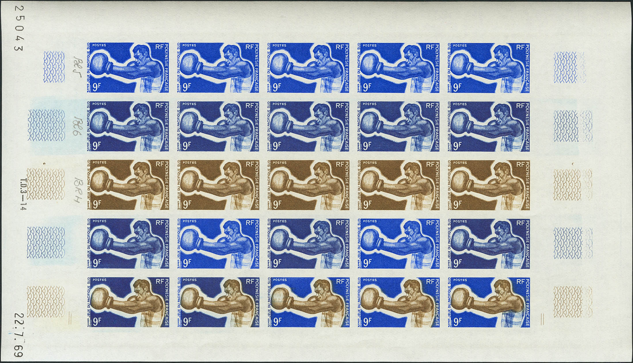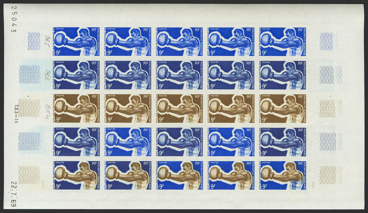 English ★★Yvert 66(25). 1969. 9 f multicolored, complete sheet of twenty-five stamps. COLOR TRIALS and WITHOUT DENTATION, in different colors and including the multicolors of the last row. MAGNIFICENT AND RARE.