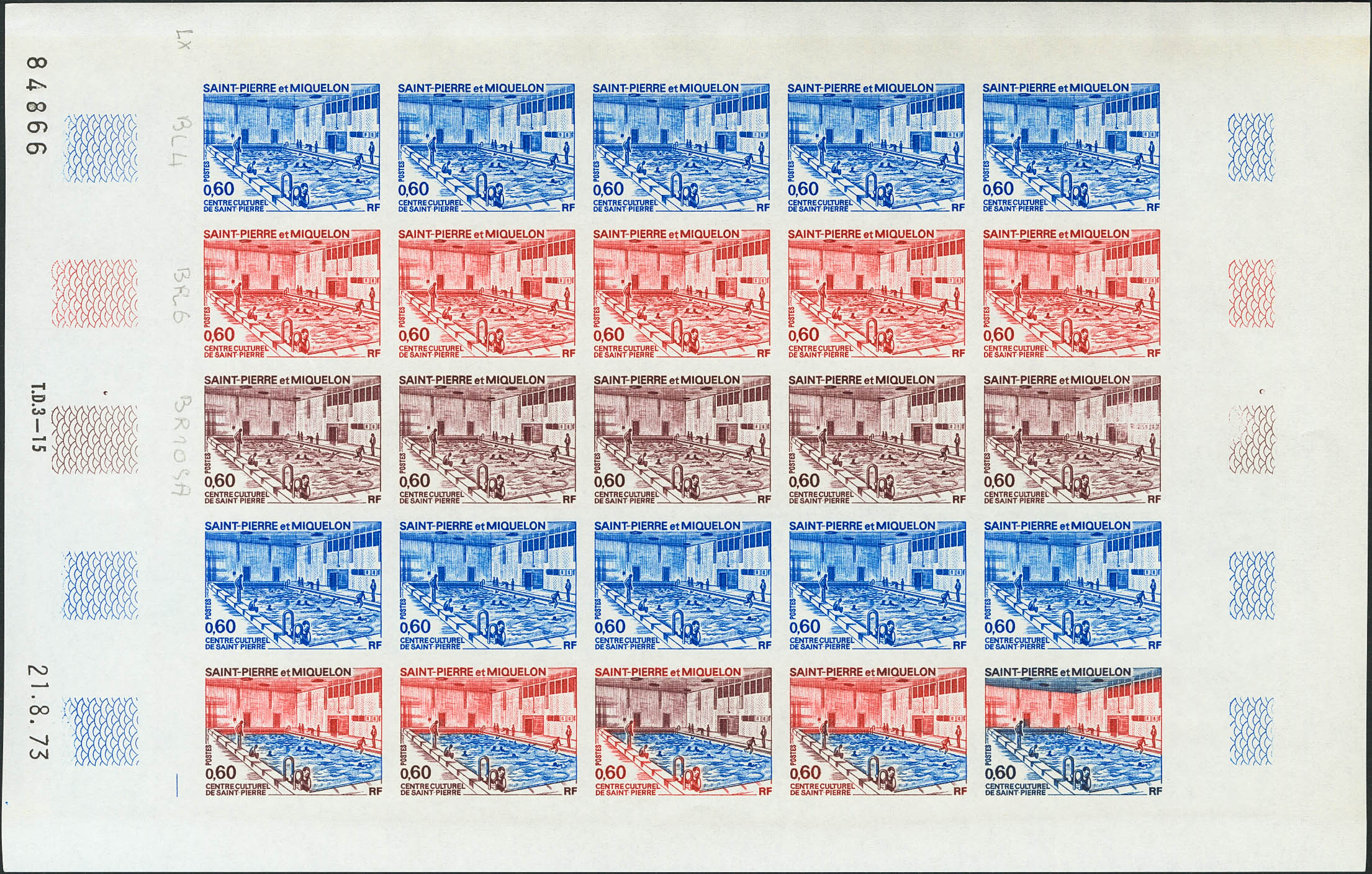 ★★Yvert 431(25). 1973. 60 multicolored cts, full sheet of twenty-five stamps. COLOR TRIALS and WITHOUT DENTATION, in different colors and including the multicolors of the last row. MAGNIFICENT AND RARE.