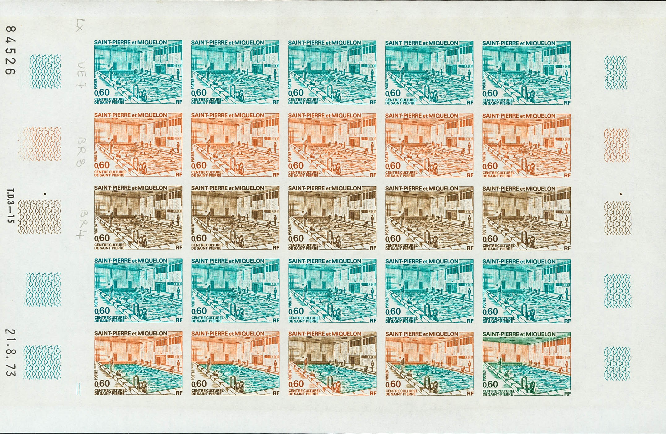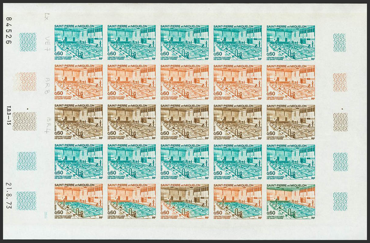 ★★Yvert 431(25). 1973. 60 multicolored cts, full sheet of twenty-five stamps. COLOR TRIALS and WITHOUT DENTATION, in different colors and including the multicolors of the last row. MAGNIFICENT AND RARE.