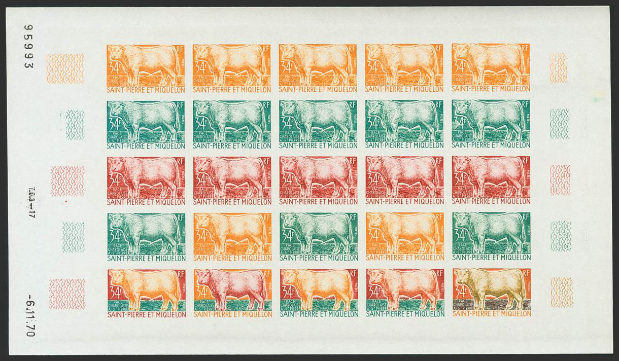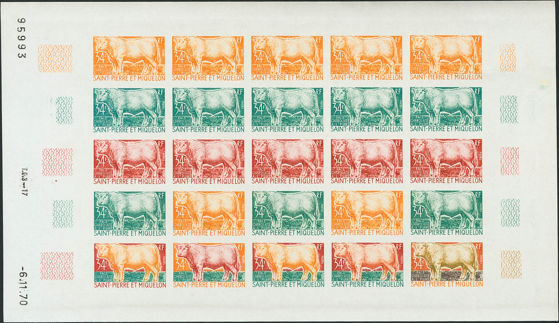 ★★Yvert 409(25). 1970. 34 f multicolored, complete sheet of twenty-five stamps. COLOR TRIALS and WITHOUT DENTATION, in different colors and including the multicolors of the last row. MAGNIFICENT AND RARE.