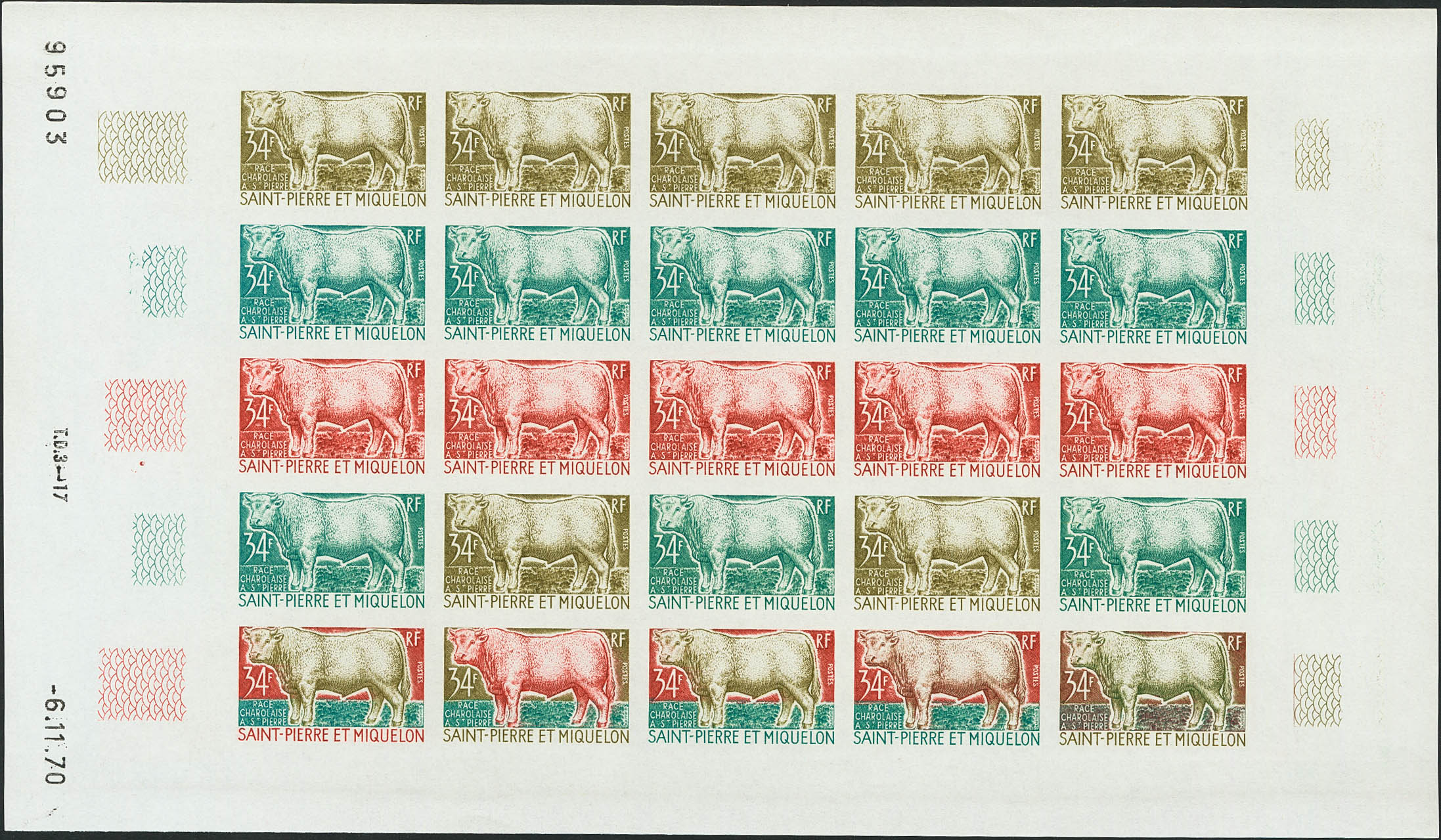 ★★Yvert 409(25). 1970. 34 f multicolored, complete sheet of twenty-five stamps. COLOR TRIALS and WITHOUT DENTATION, in different colors and including the multicolors of the last row. MAGNIFICENT AND RARE.