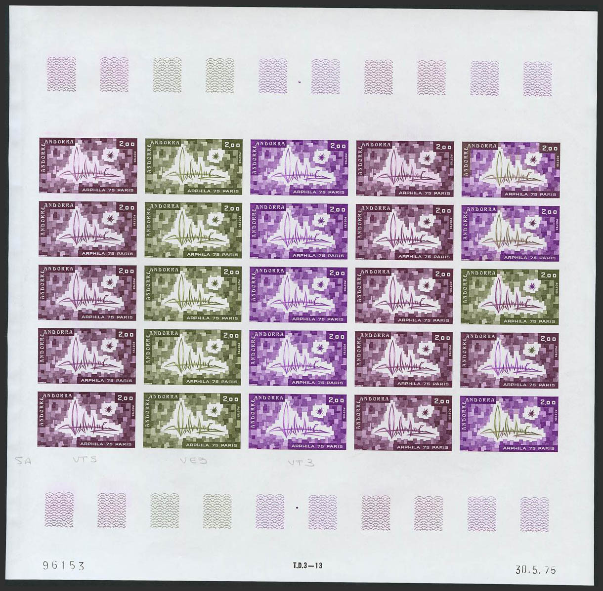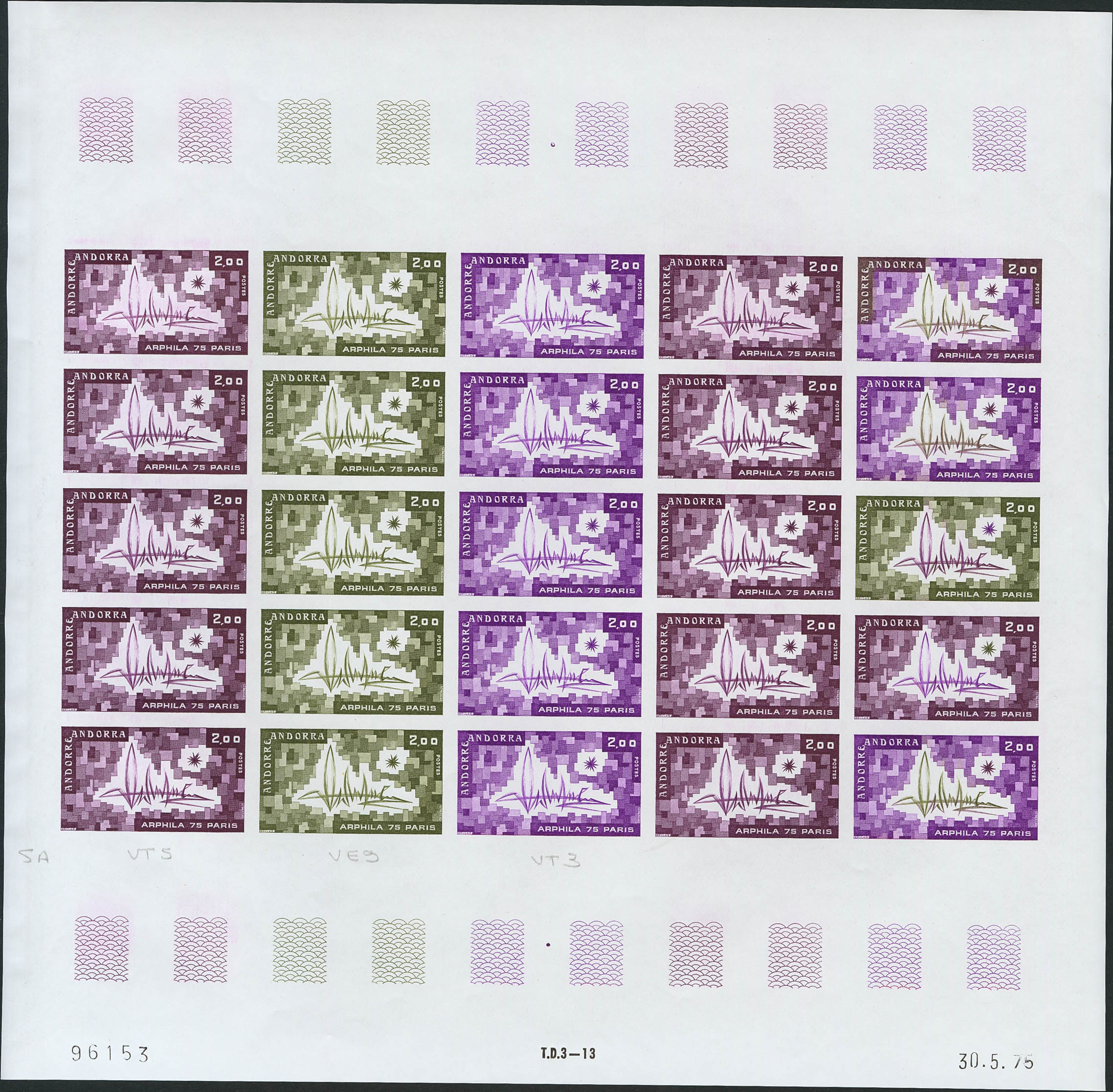 ★★Yvert 248(25). 1975. 2 multicolored fr, full sheet of twenty-five stamps. COLOR TRIALS and WITHOUT DENTATION, in different colors and including the multicolors of the last row. MAGNIFICENT AND RARE.