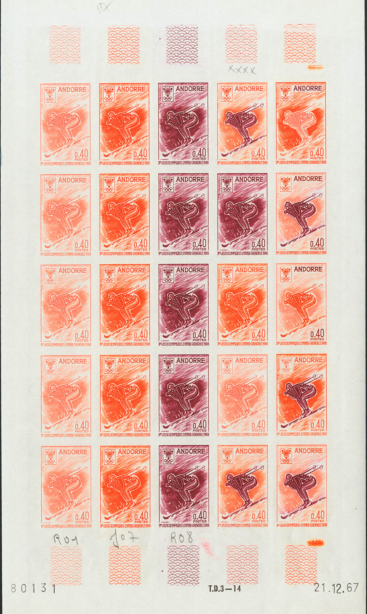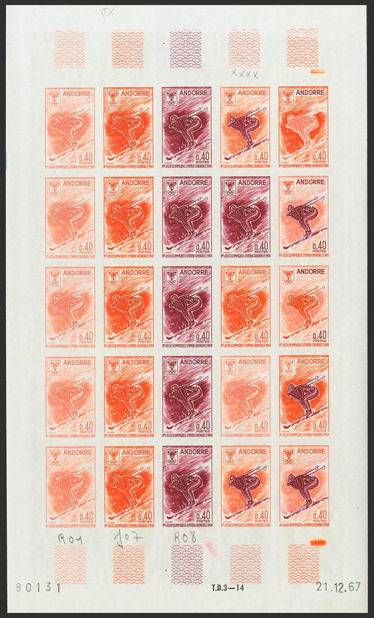 ★★Yvert 187(25). 1968. 40 multicolored cts, full sheet of twenty-five stamps. COLOR TRIALS and WITHOUT DENTATION, in different colors and including the multicolors of the last row. MAGNIFICENT AND RARE.