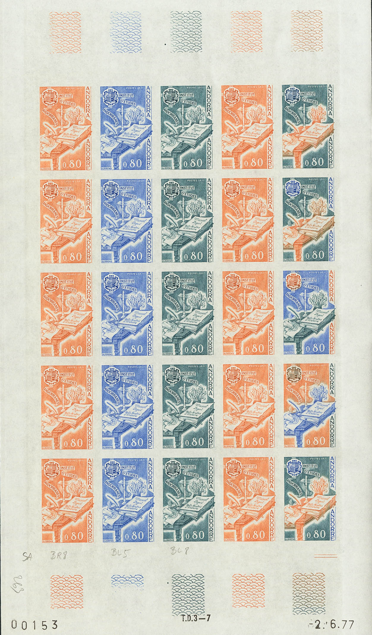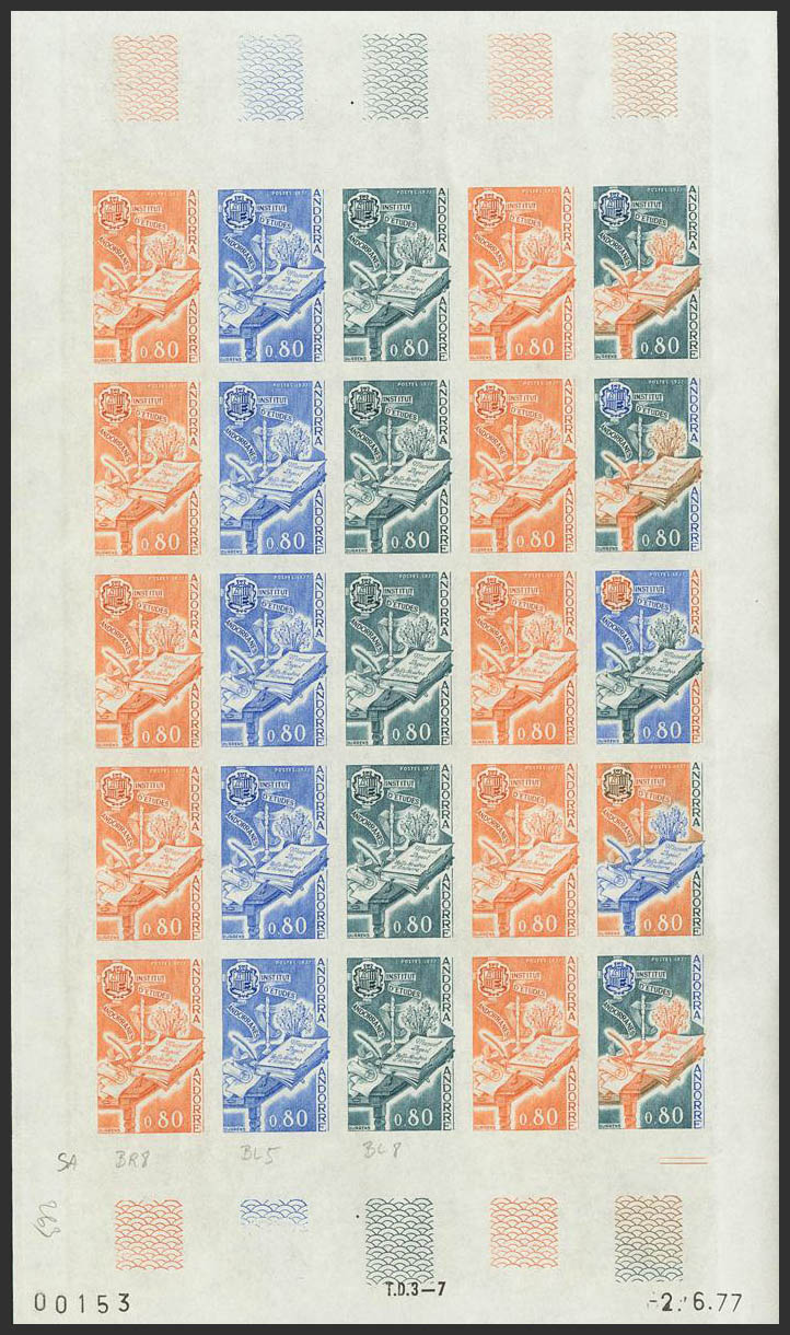 ★★Yvert 263(25). 1977. 80 multicolored cts, full sheet of twenty-five stamps. COLOR TRIALS and WITHOUT DENTATION, in different colors and including the multicolors of the last row. MAGNIFICENT AND RARE.