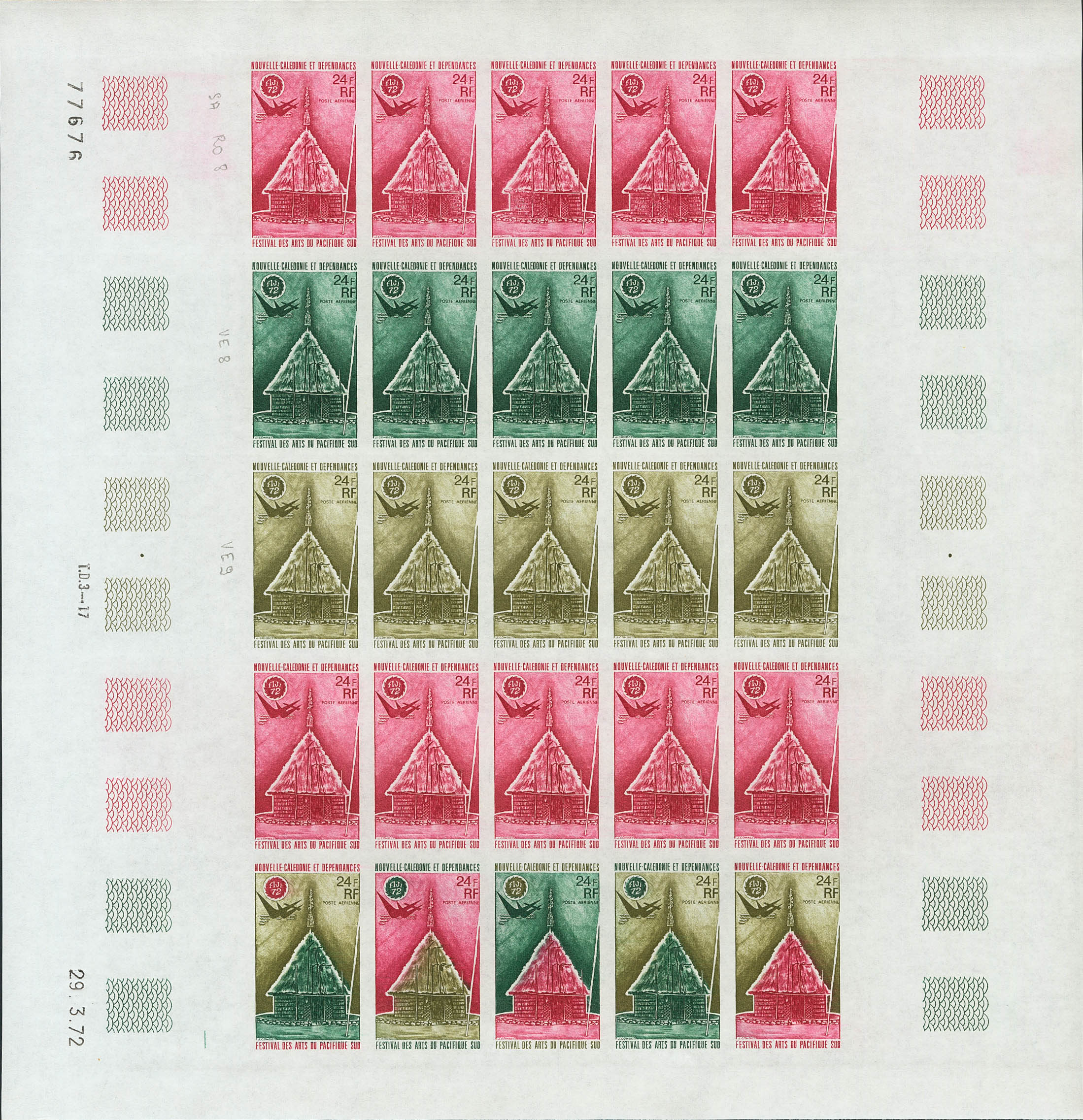★★Yvert 132(25). 1972. 24 f multicolored, complete sheet of twenty-five stamps. COLOR TRIALS and WITHOUT DENTATION, in different colors and including the multicolors of the last row. MAGNIFICENT AND RARE.