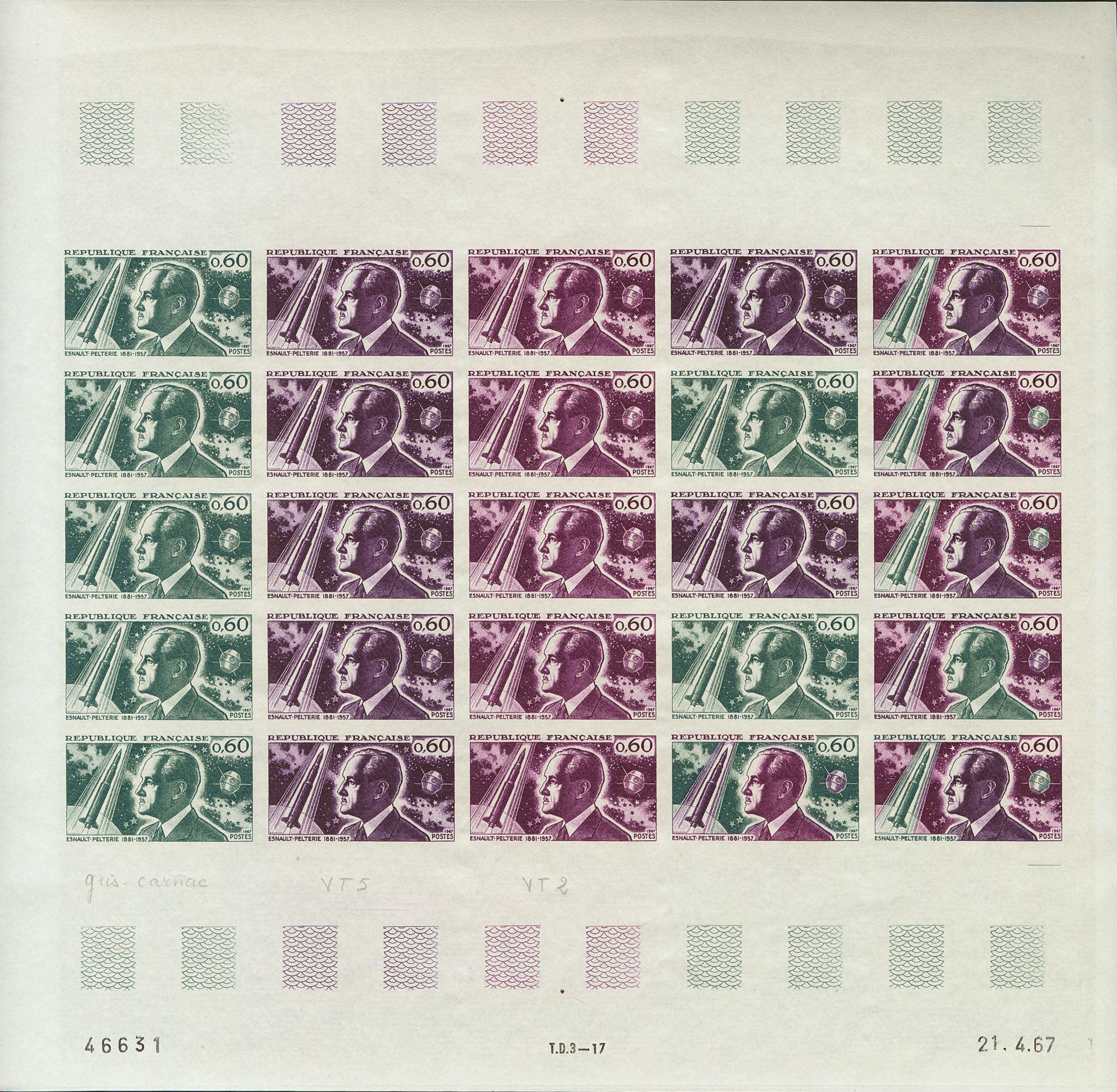 ★★Yvert 1526(25). 1967. 60 multicolored cts, full sheet of twenty-five stamps. COLOR TRIALS and WITHOUT DENTATION, in different colors and including the multicolors of the last row. MAGNIFICENT AND RARE. (Maury 1526 2,225 Euros)