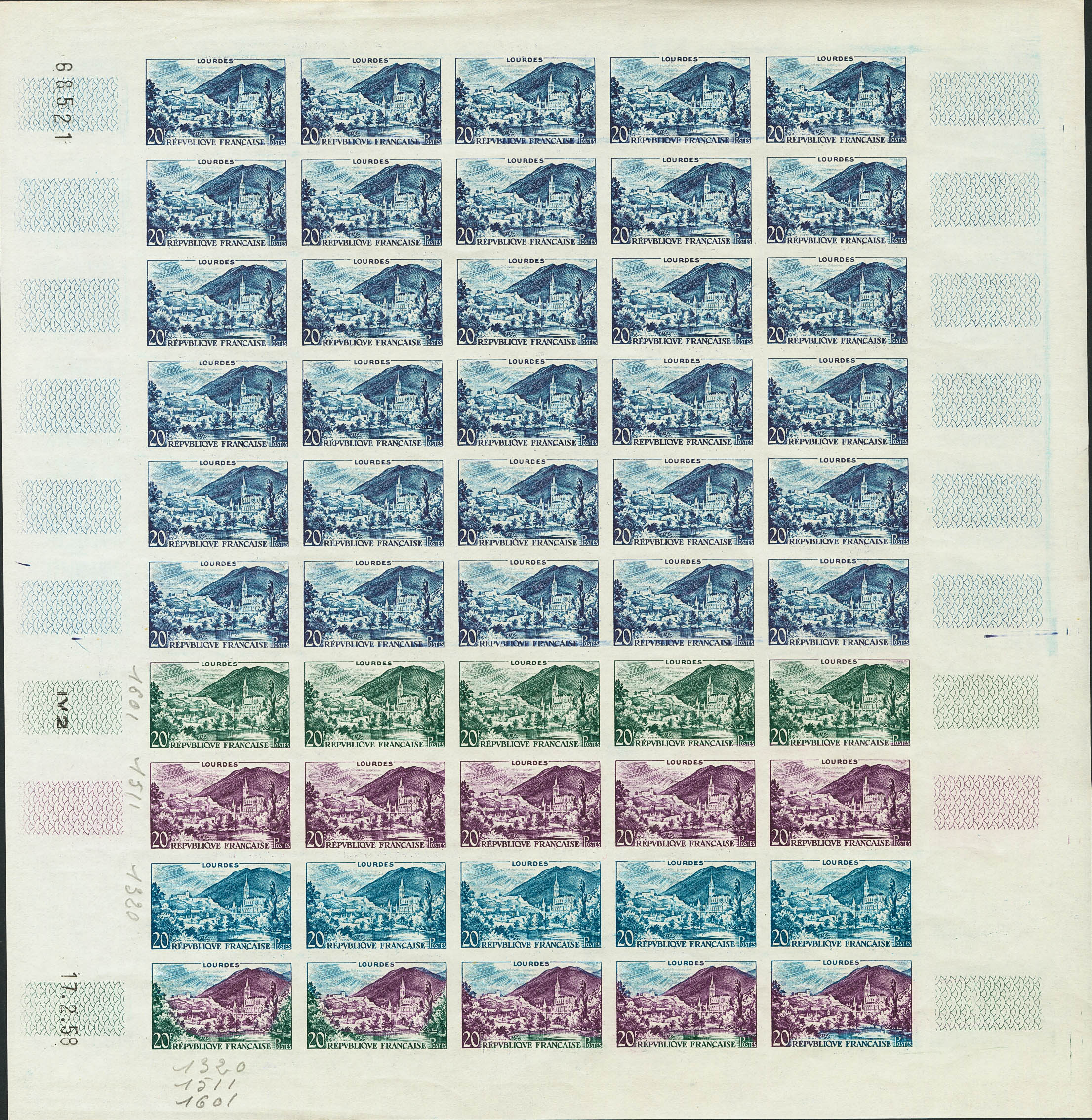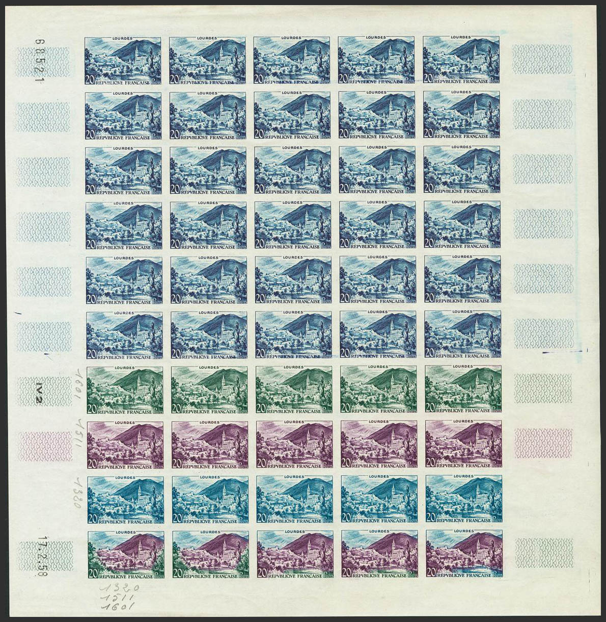 ★★Yvert 1150(50). 1958. 20 multicolored cts, full sheet of fifty stamps. COLOR TRIALS and WITHOUT DENTATION, in different colors and including the multicolors of the last row. MAGNIFICENT AND RARE. (Maury 1150 1,200 Euros)