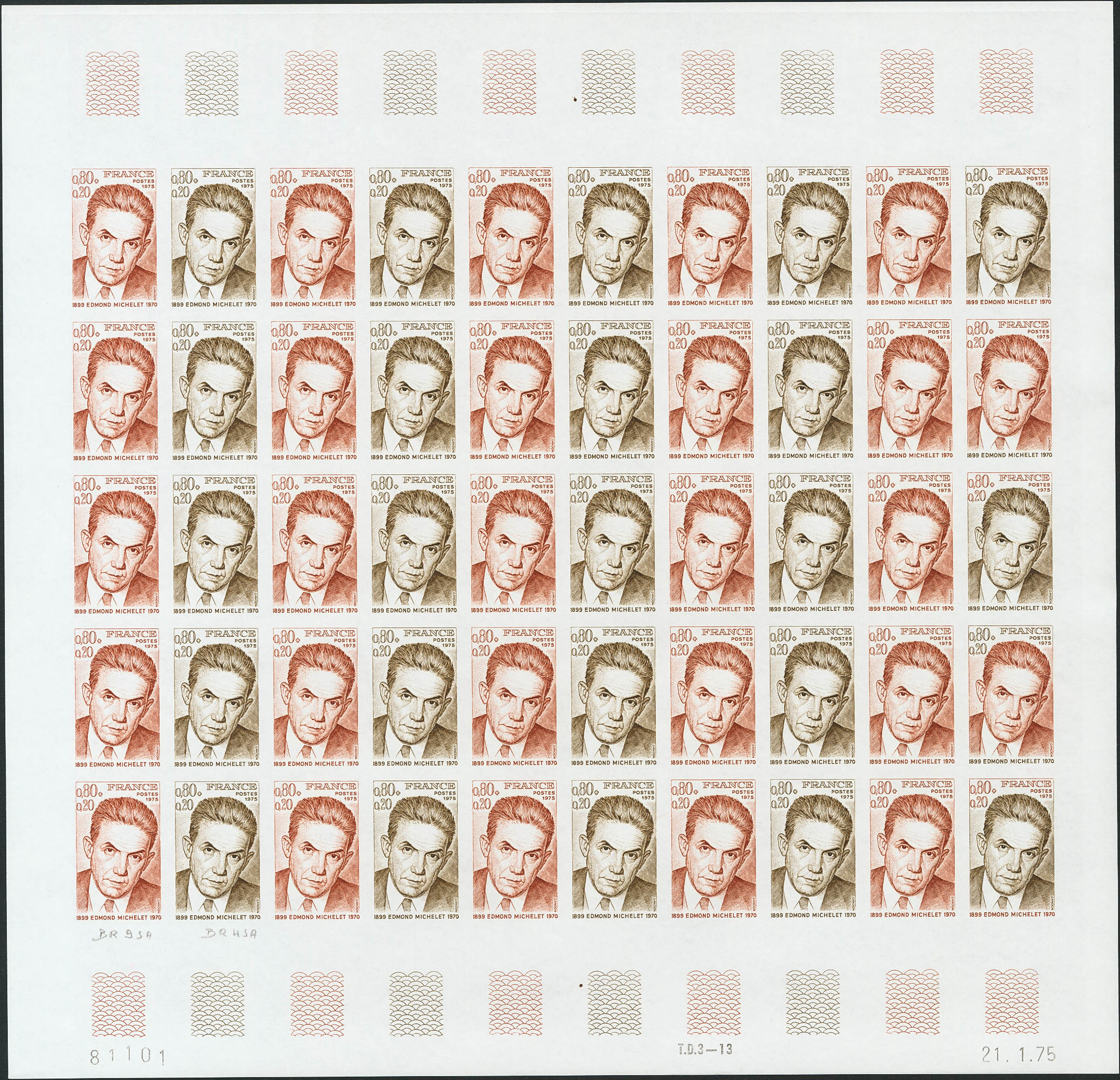 ★★Yvert 1825(50). 1975. 80 cts + 20 multicolored cts, full sheet of fifty stamps. COLOR TRIALS and WITHOUT DENTATION, in different colors and including the multicolors of the last row. MAGNIFICENT AND RARE. (Maury 1827 950 Euros)