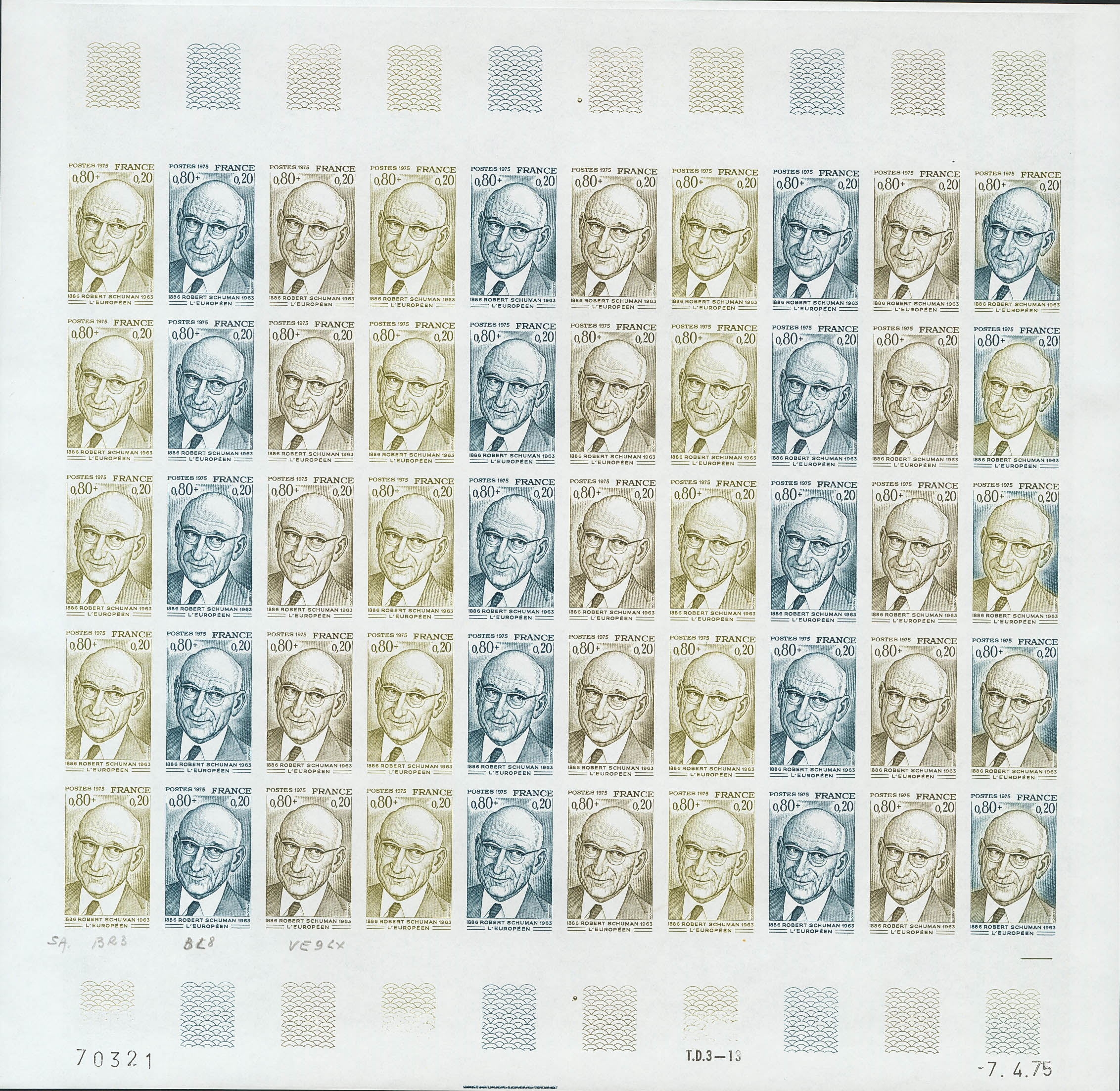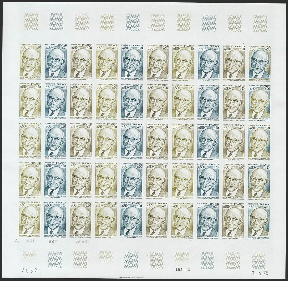 ★★Yvert 1826(50). 1975. 80 cts + 20 multicolored cts, full sheet of fifty stamps. COLOR TRIALS and WITHOUT DENTATION, in different colors and including the multicolors of the last row. MAGNIFICENT AND RARE. (Maury 1828 950 Euros)