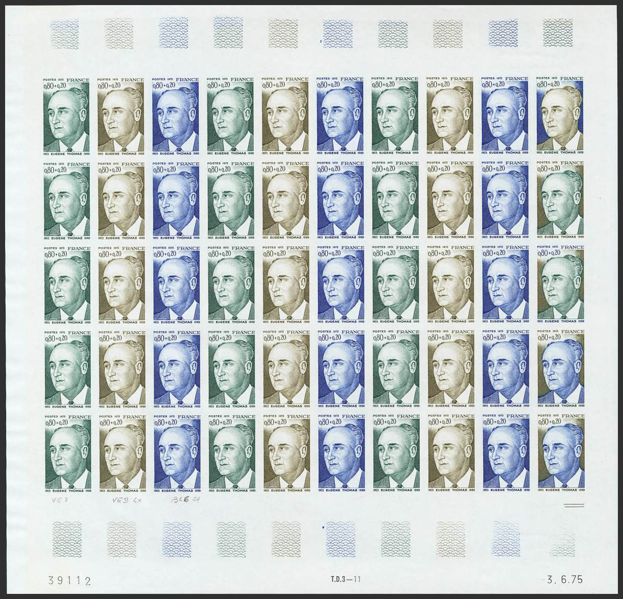 ★★Yvert 1827(50). 1974. 80 cts + 20 multicolored cts, full sheet of fifty stamps. COLOR TRIALS and WITHOUT DENTATION, in different colors and including the multicolors of the last row. MAGNIFICENT AND RARE. (Maury 1829 +950 Euros)