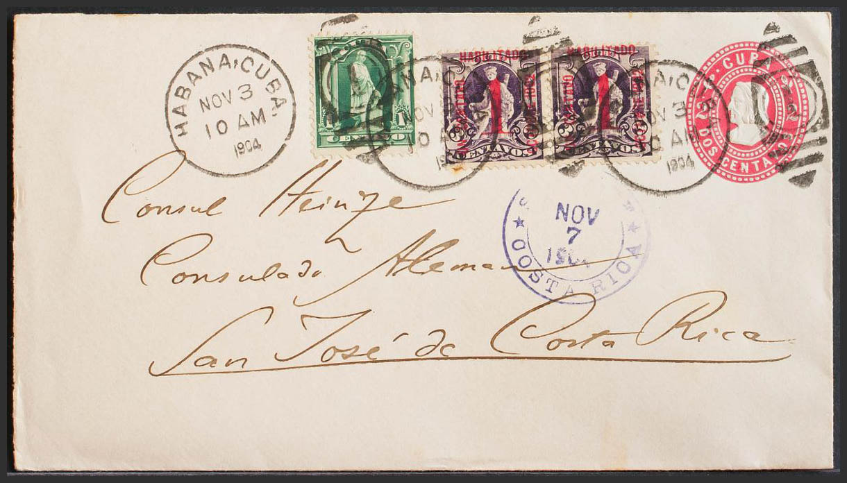 Yvert 142, 147(2). 1904. 2 cents pink envelope Postal from HAVANA to SAN JOSE (COSTA RICA), with additional postage of 1 cent green and 1 cent on 3 cents violet. On the arrival front. MAGNIFICENT.
