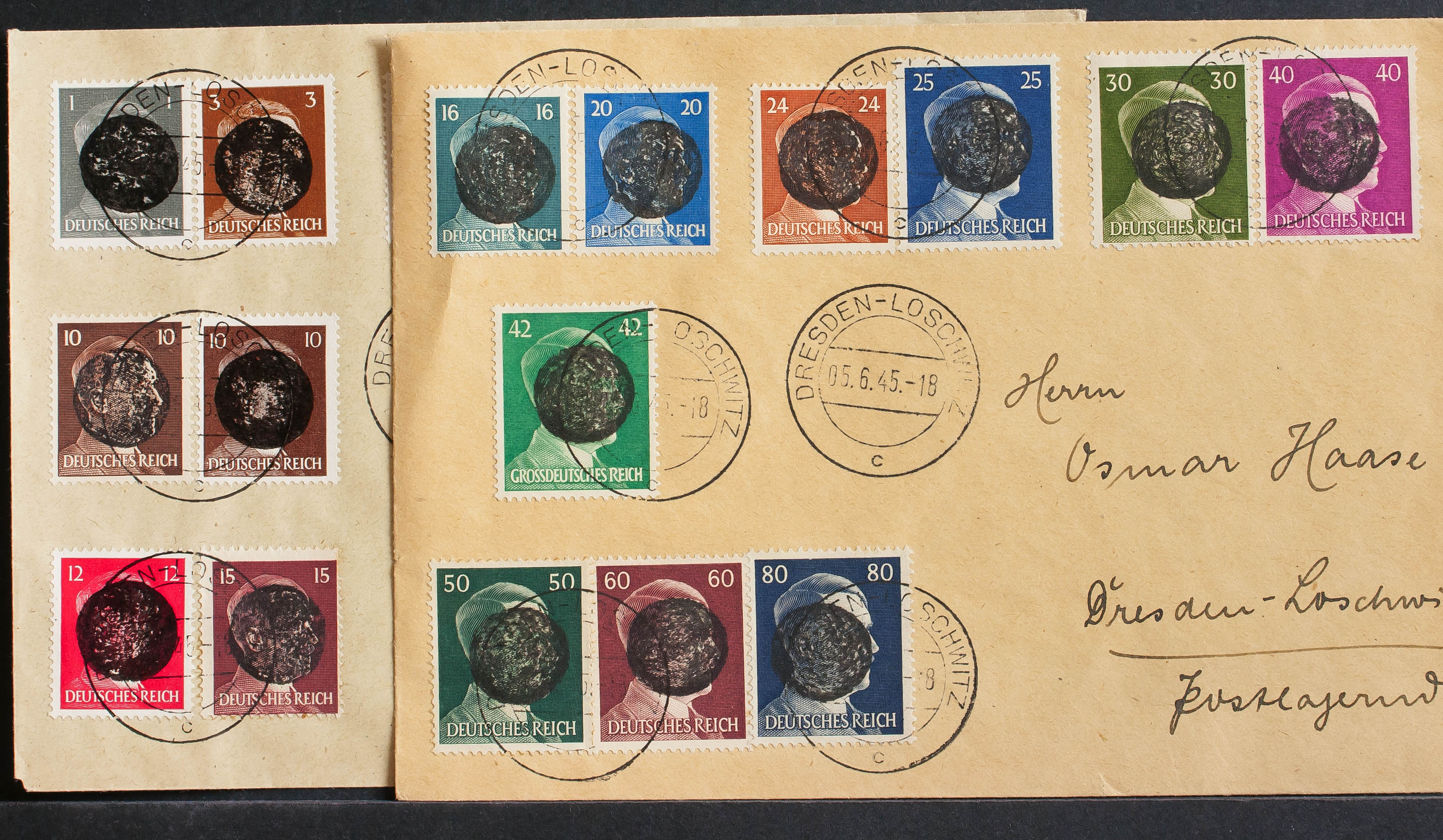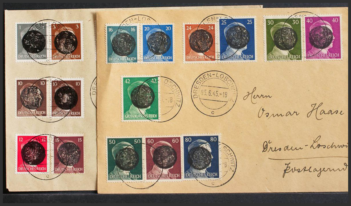 English 1945. Complete series, nineteen values on two Philatelic letters from DRESDEN-LOSCHWITZ. MAGNIFICENT AND RARE. (Mi1/19 ++350 Euro)