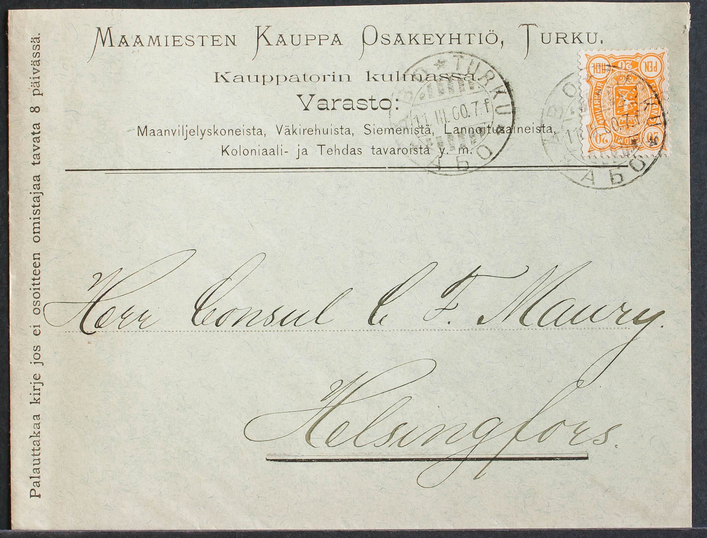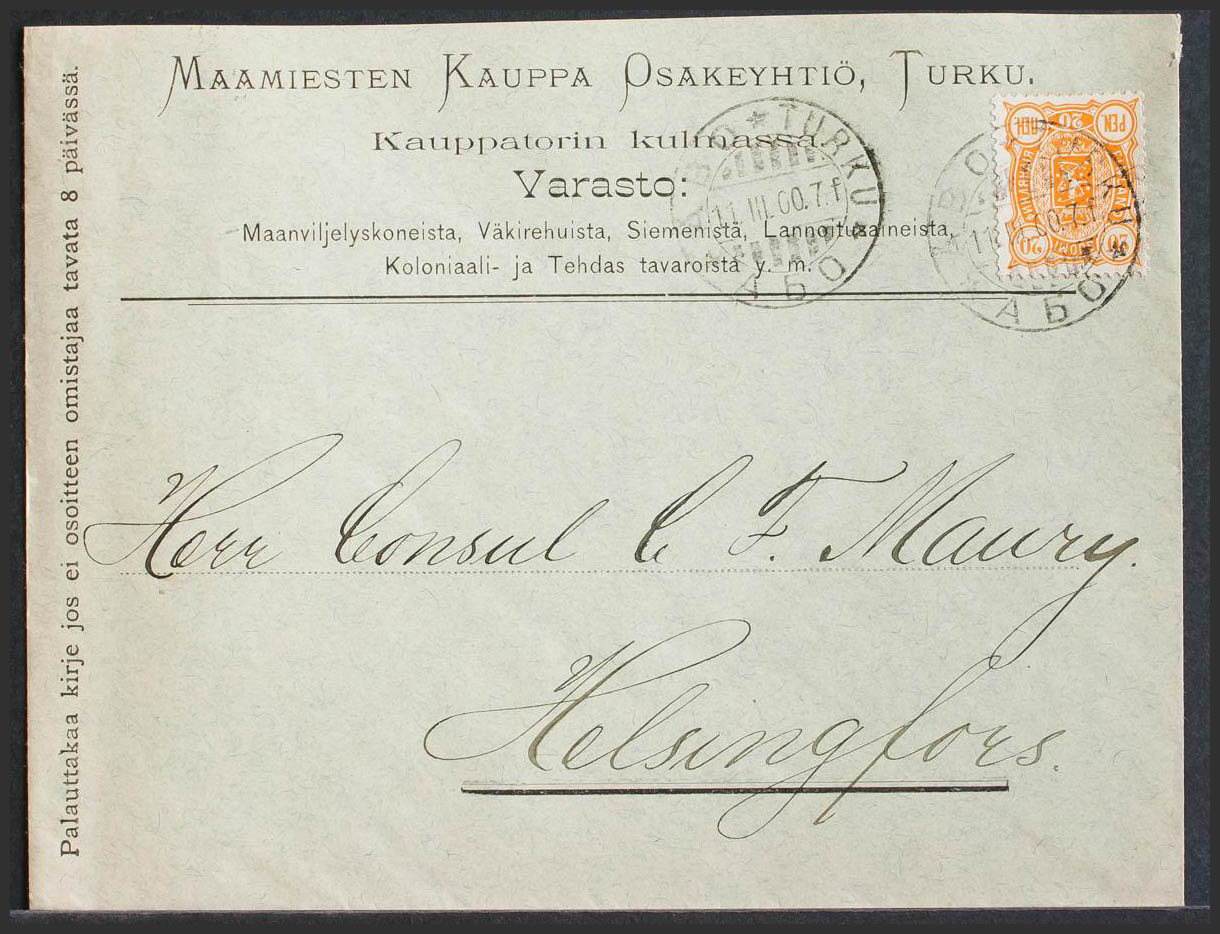 Yvert 31. 1900. 20 orange p. TURKU to HELSINKI. MAGNIFICENT.