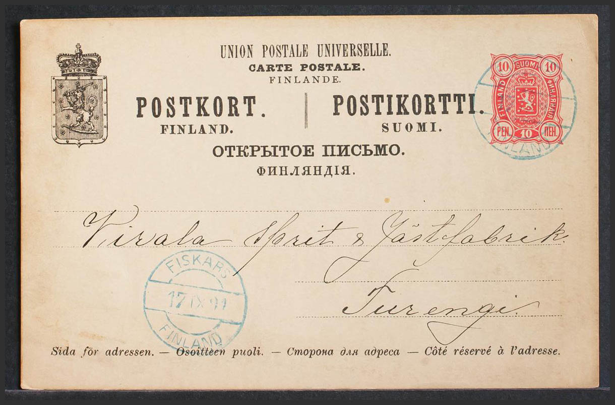 1891. 10 p red cover Entire Card Postcard from FISKARS to TURENGI. FISKARS / FINLAND postmark, in blue. MAGNIFICENT.