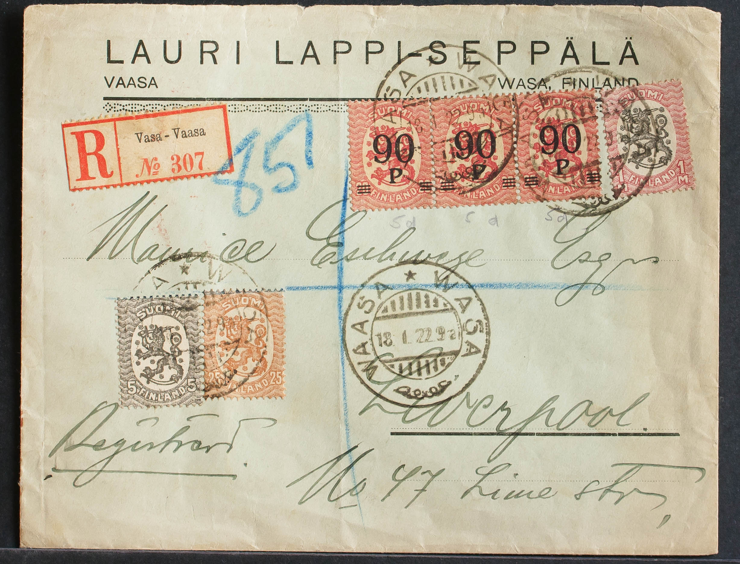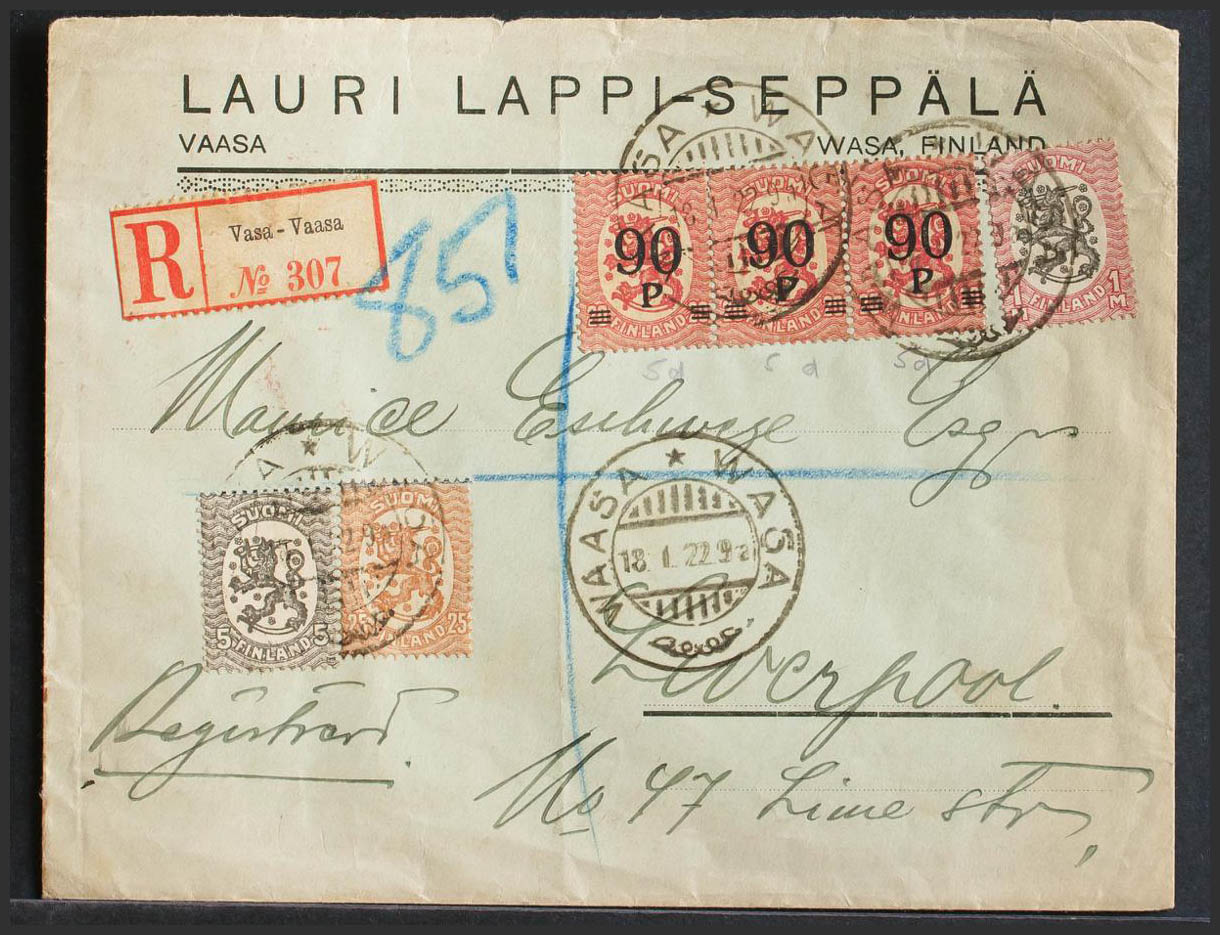 Yvert 97(3), 67, 73, 77. 1922. 90p on 20p pink, strip of three and various values. Certificate from WAASA to LIVERPOOL (ENGLAND). On the back arrival. MAGNIFICENT.