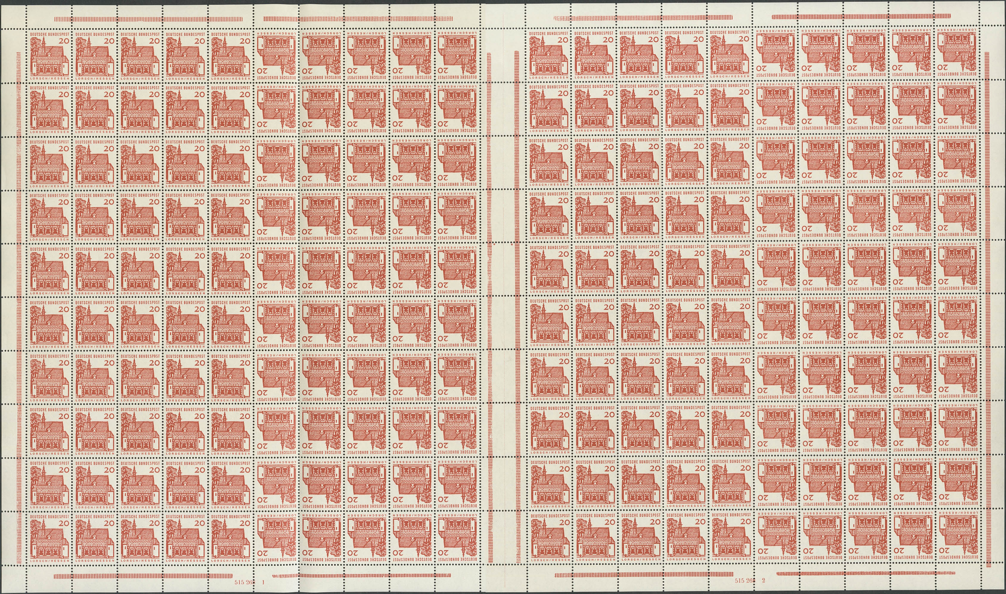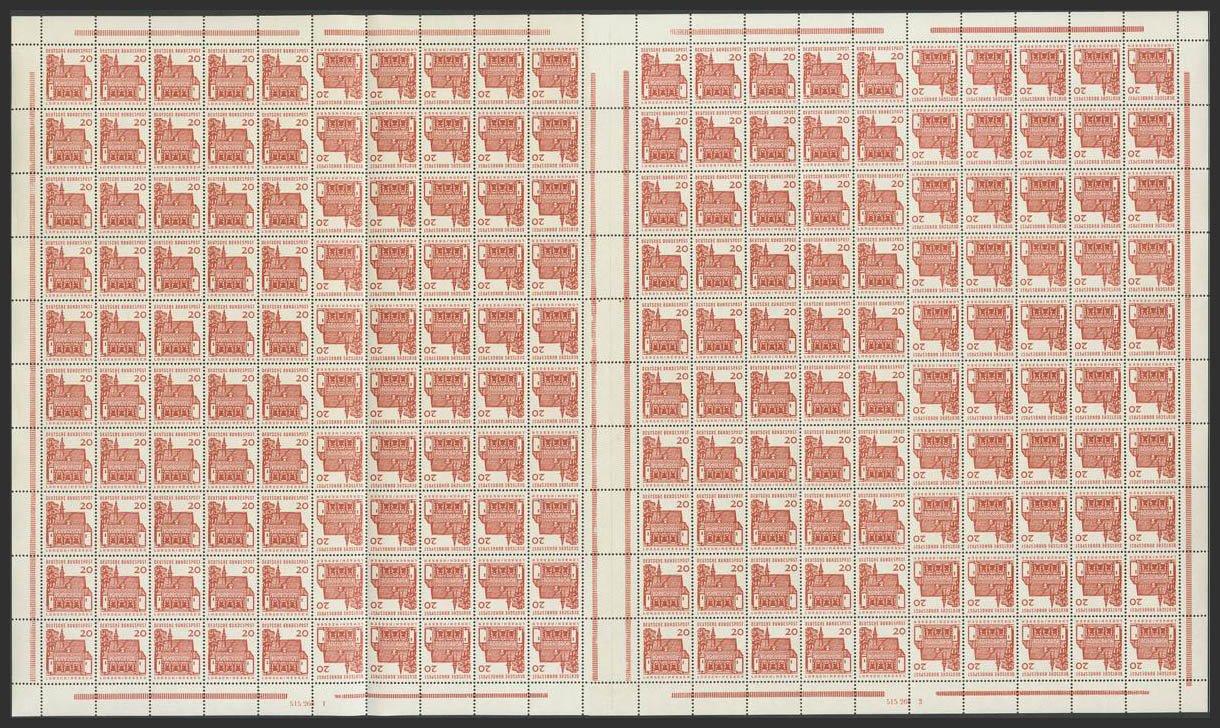 English ★★1966. 20 p red chestnut, complete sheet (folded the left margin for its conservation in the book cover) of two hundred stamps with central interpanel and the TETE BECHE combinations. MAGNIFICENT. (My MHB11 110 Euros)