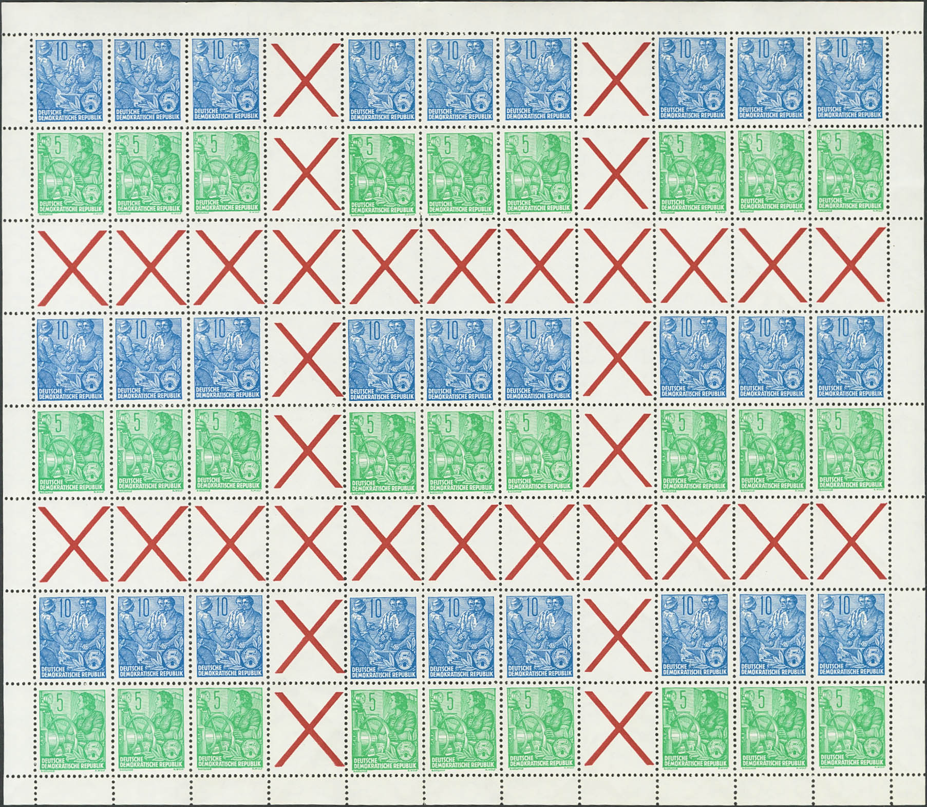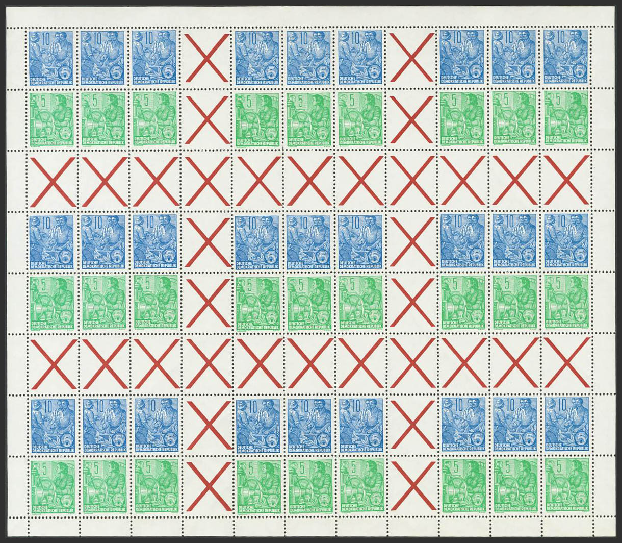 ★★Yvert 149, 190. 1955. 5 p green yellow and 10 p blue, complete sheet (folded for storage in the book cover) with various combinations of sheets or blocks for cards with interpanel and TETE BECHE. MAGNIFICENT. (My MHB1 280 Euros)