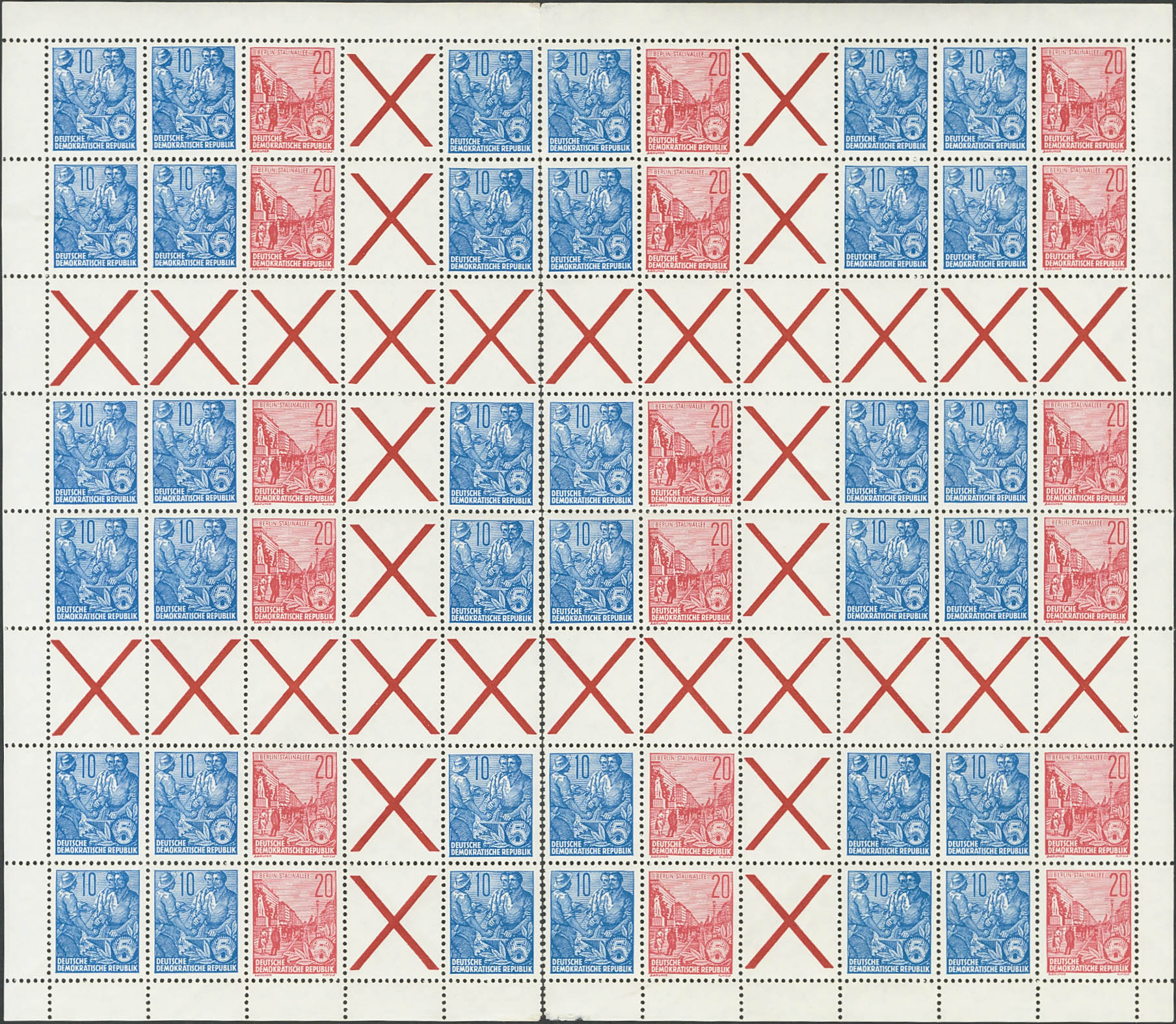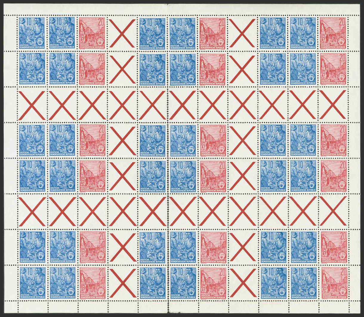 ★★Yvert 190, 191. 1955. 10 p blue and 20 p carmine red, complete sheet (folded for storage in the book cover) with various combinations of sheets or blocks for cards with interpanel and TETE BECHE. MAGNIFICENT. (My MHB3 350 Euros)