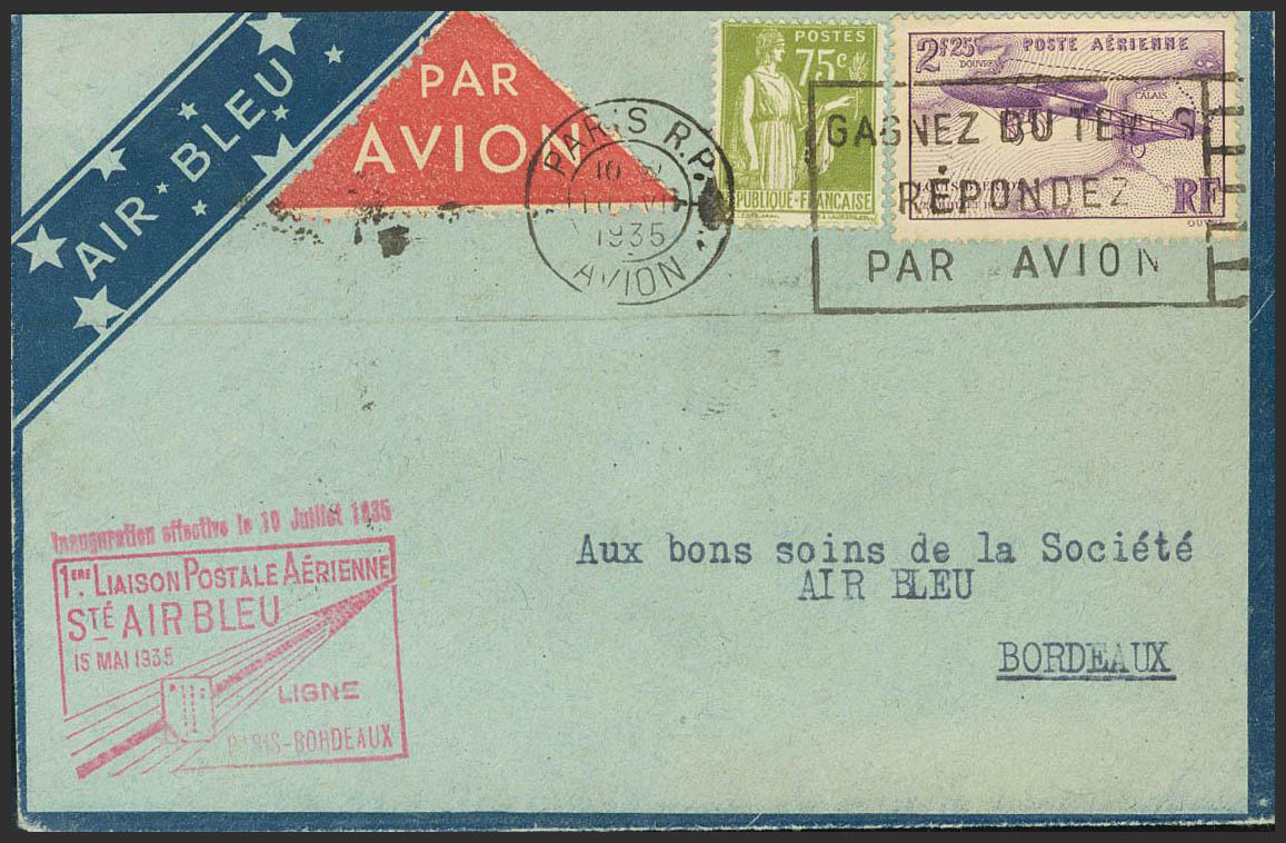 Yvert 7. 1935. 2´25 fr lilac and 75 cts olive green. Airmail from PARIS to BORDEAUX. On the front mark 1º LIAISON POSTALE AERIENNE / AIR BLEU / LIGNE / PARIS-BORDEAUX. MAGNIFICENT.